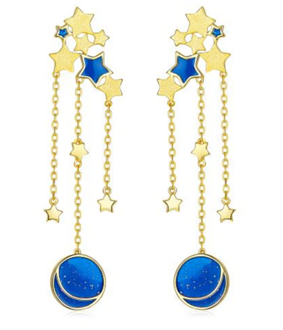 Blue & Golden Moon Star Enamel Drop Earrings for Women