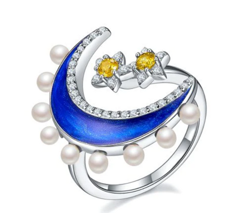Moon Star Enamel with Pearl Sliver Ring for Women