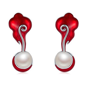 Red Ornamental Sceptre Enamel with Pearl Silver Drop Earrings for Women