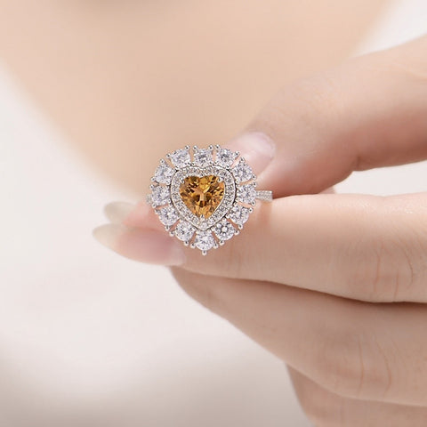 Natural Yellow Crystal 7*7mm Heart Shape Soleste Halo Silver Ring for Women