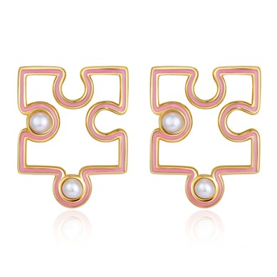 Golden Puzzle Enamel with Pearls Studs Earrings for Women