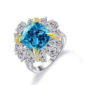 Blue Zircon 10*10mm Cushion Ice Cut Luxurious Silver Ring for Women