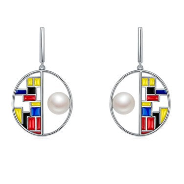Colourful Mondrian Enamel with Pearls Silver Drop Earrings for Women