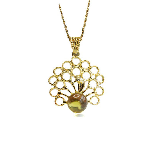 Gold Amber Peacock Necklace with Sterling Silver Chain