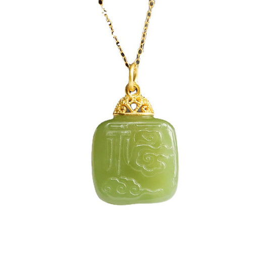 Sterling Silver Necklace with Natural Hetian Jade Square Pendant Featuring Auspicious Cloud and Blessing Design