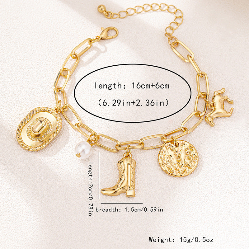 European and American Personalized Fashion Cross-Border Simple Metal Pony Hat High Heels Pearl Pendant Women's Bracelet by Planderful delivers a chic and sophisticated style for every fashion enthusiast. This exquisite bracelet is perfect for elevating your outfit for special occasions or daily wear.