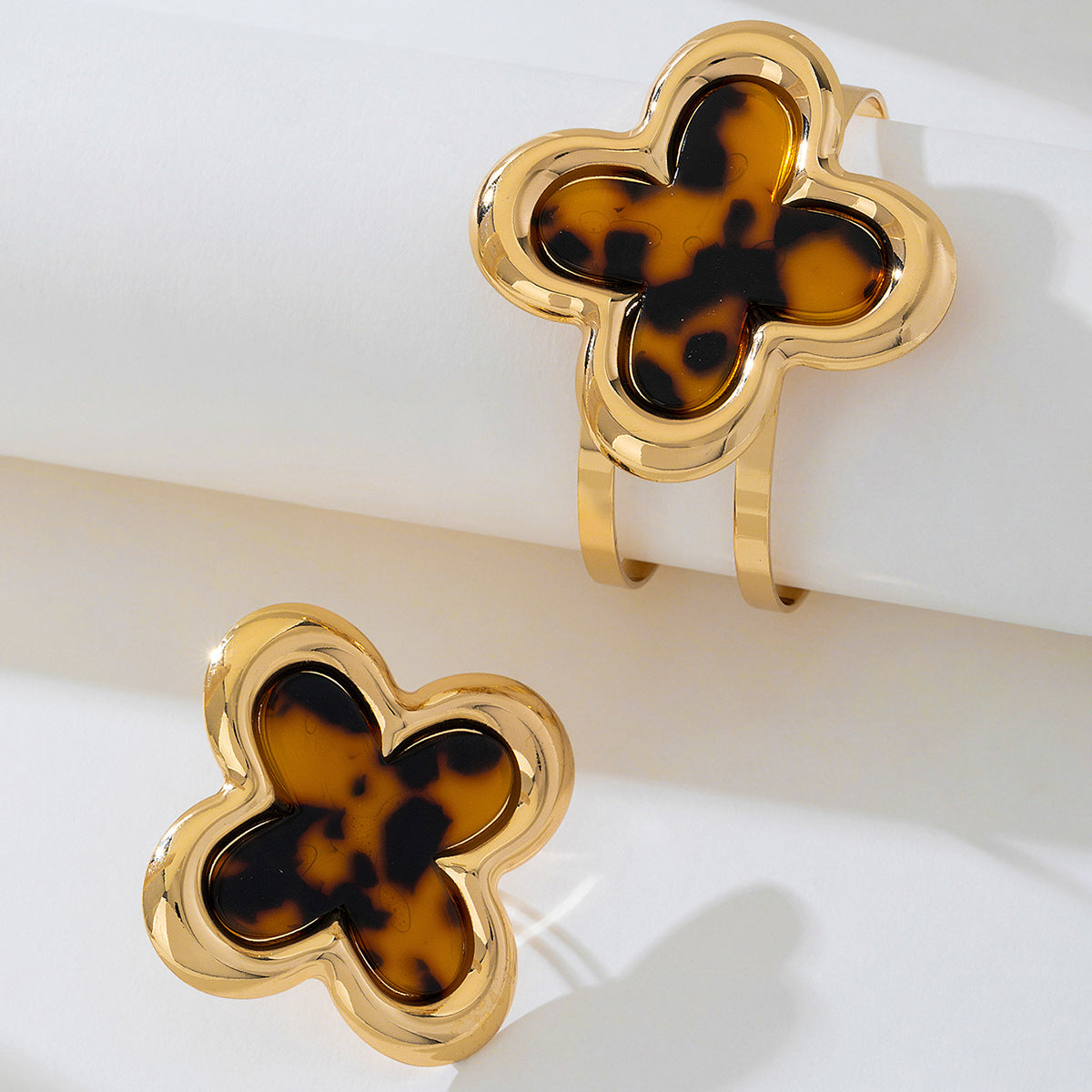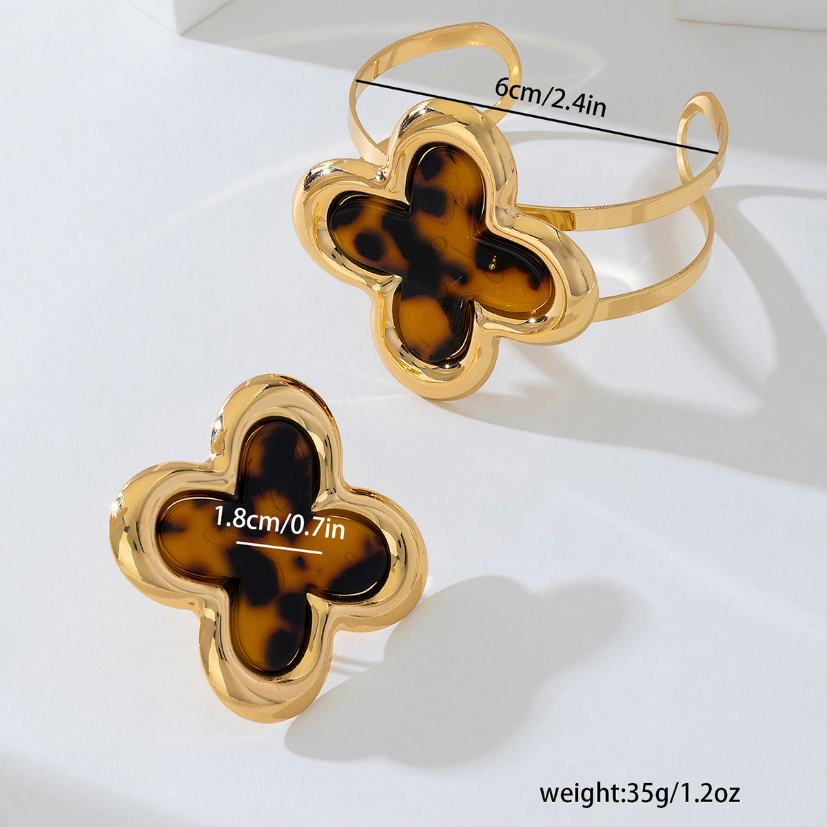 Discover the Planderful 2-piece Set from the Vienna Verve collection — a fashionable and versatile metal jewelry duo designed for the modern woman. This open bracelet and ring pair showcases a bold leopard print motif that artfully blends a five-petaled flower with a five-leaf clover, delivering a unique statement for everyday wear or special occasions.