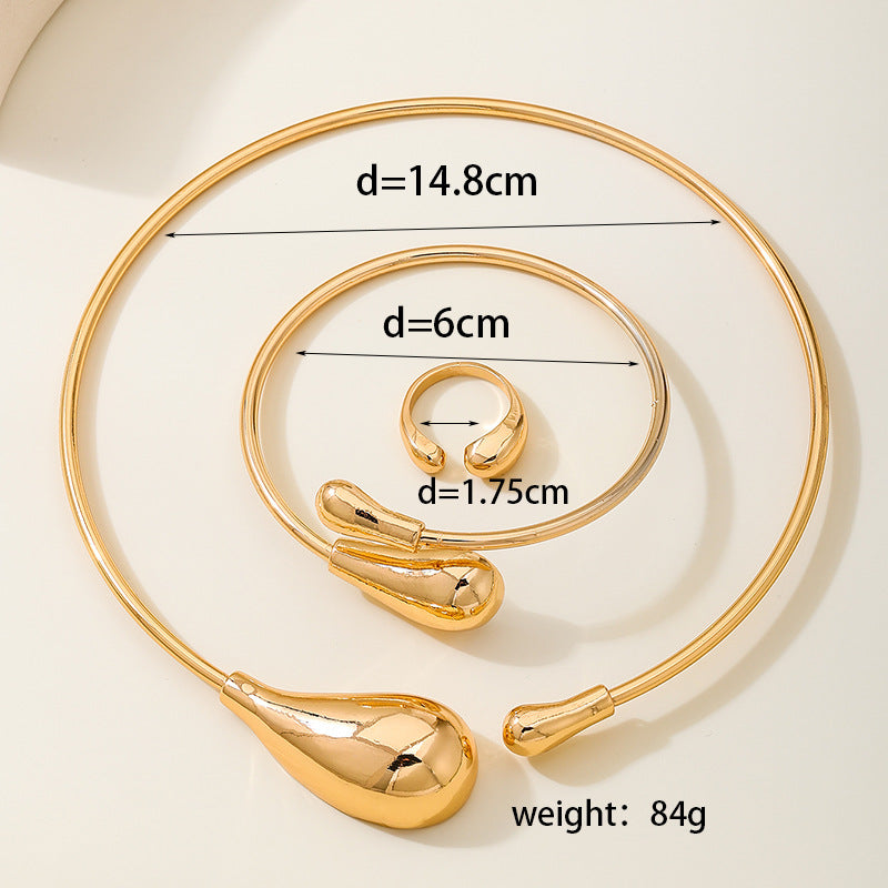 Elevate your style with the 3-piece set of European and American fashion—a stunning metal gold water drop opening women's bracelet collar ring jewelry set that embodies elegance and contemporary design.