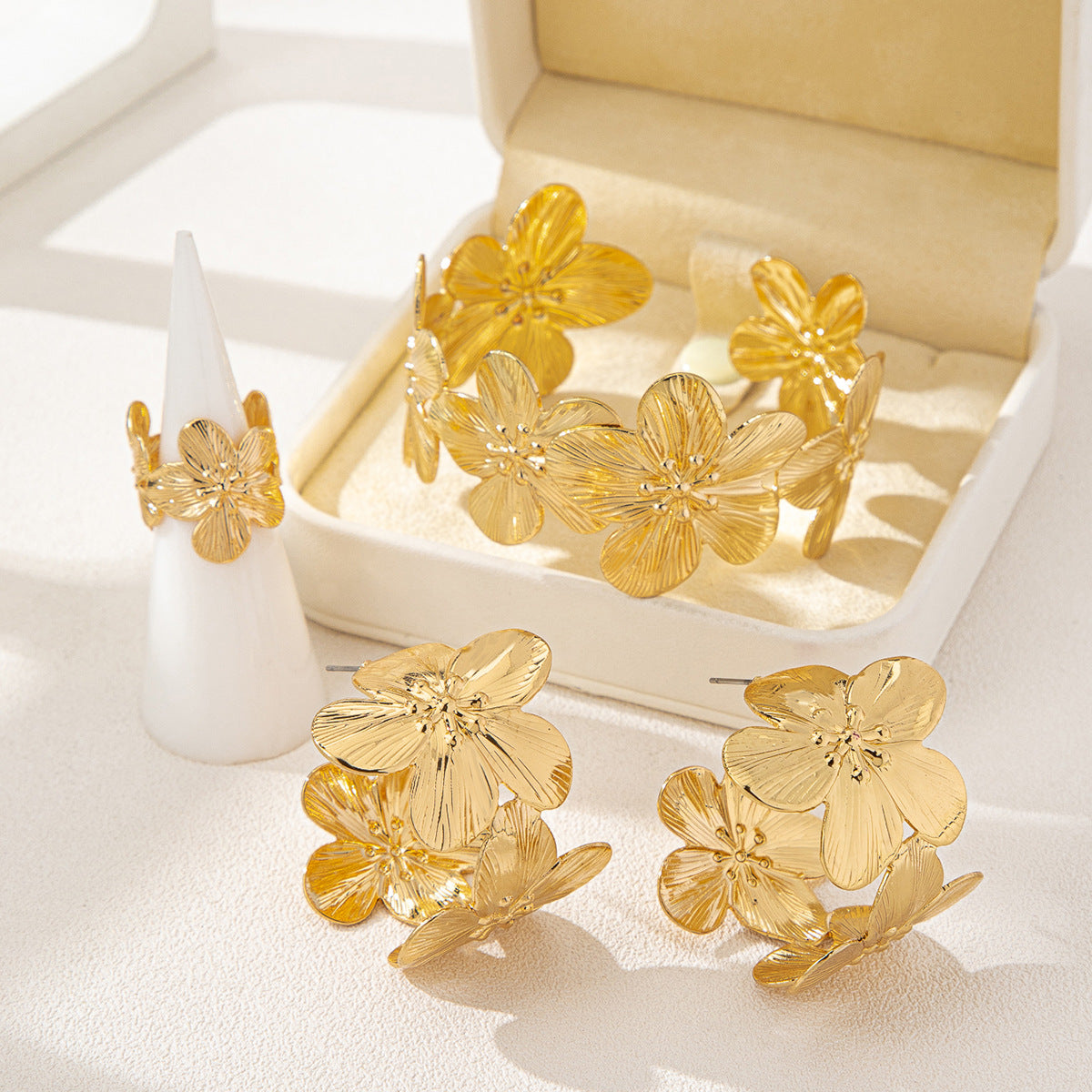 Elevate everyday elegance with Planderful's 4 Stylish Elegant Flower Earrings Ring Bracelet Jewelry Set from the Vienna Verve collection. This coordinated ensemble brings a refined, floral-inspired touch to any outfit, whether you're dressing for work, a special occasion, or a night out.