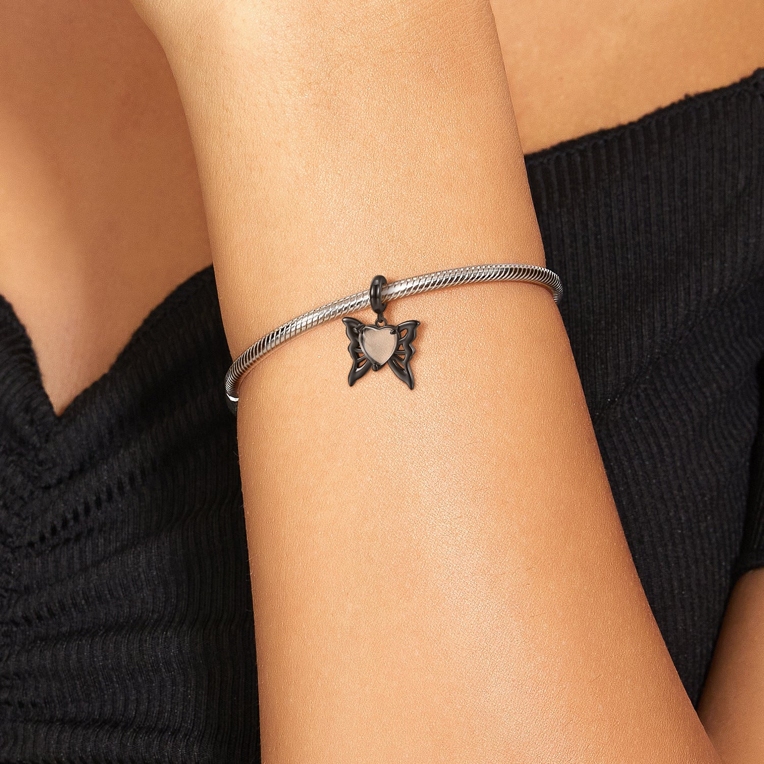 This sterling Silver Pendant features a black butterfly inlaid with a heart shaped glass, perfect for self-expression. Its delicate design and stunning black colour combination make it the perfect accessories for DIY any necklace or bracelet.