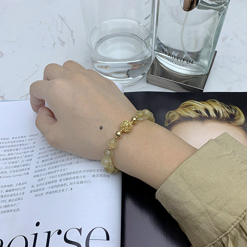 Indulge in the captivating beauty of our Natural Crystal Bracelet, designed to embody the essence of female minority style. The intricate hollow ball and the serene tea crystal, complemented by the shimmering golden hair crystal, come together in a mesmerizing ensemble that exudes elegance and grace.