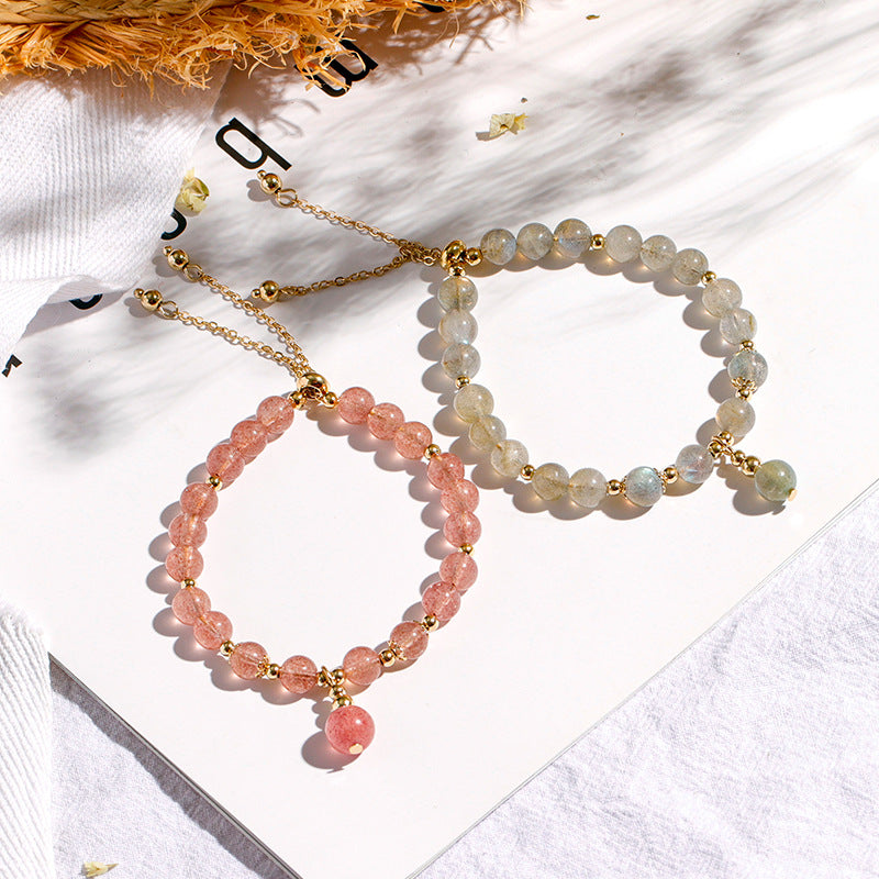 Indulge in the delicate allure of the Strawberry Crystal Bracelet. This bracelet features exquisite pink crystals and moonlight stones, creating a mesmerizing blend of elegance and charm. Whether it's a special occasion or a casual day out, this Korean edition bracelet is a perfect fit for all.