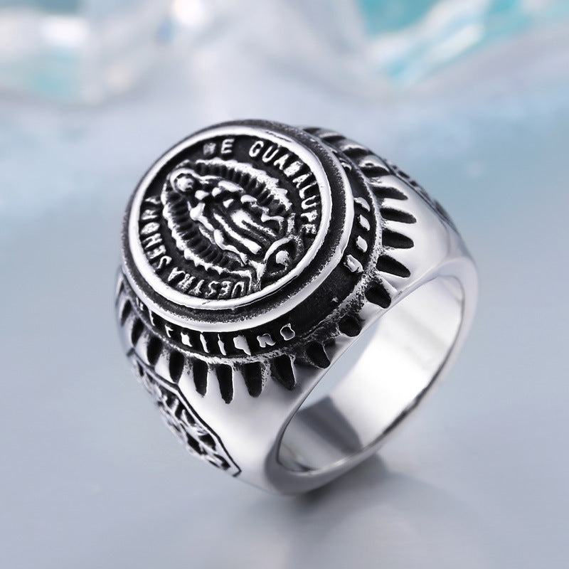Embrace a blend of spirituality and sophistication with our European and American retro Virgin Mary icon ring. Crafted from durable titanium steel, this personalized piece of jewelry is designed for the modern man who appreciates both style and meaning.