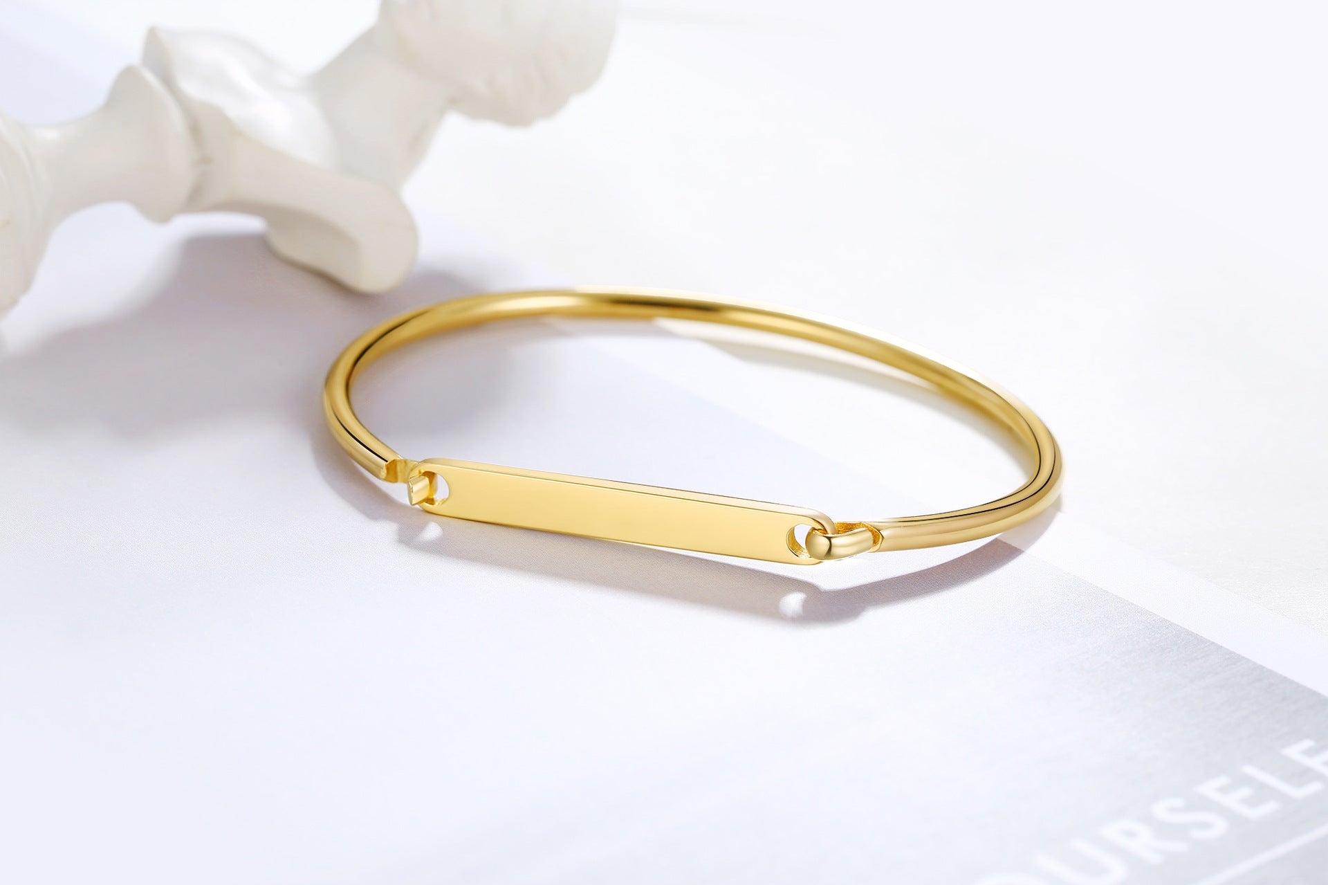 The curved design of this bracelet elegantly wraps around your wrist, providing a comfortable fit and a sophisticated look. The simple lettering adds a touch of personalization, making it a perfect gift for yourself or a loved one.