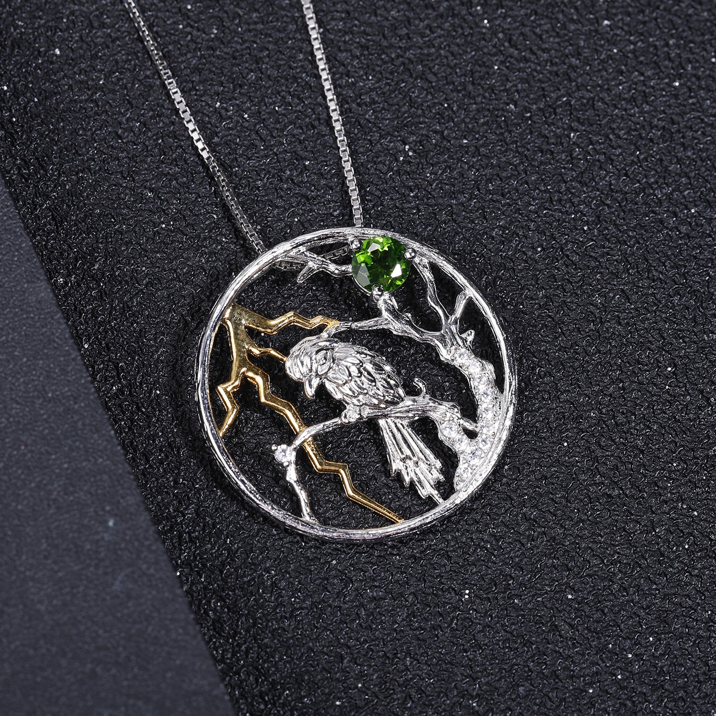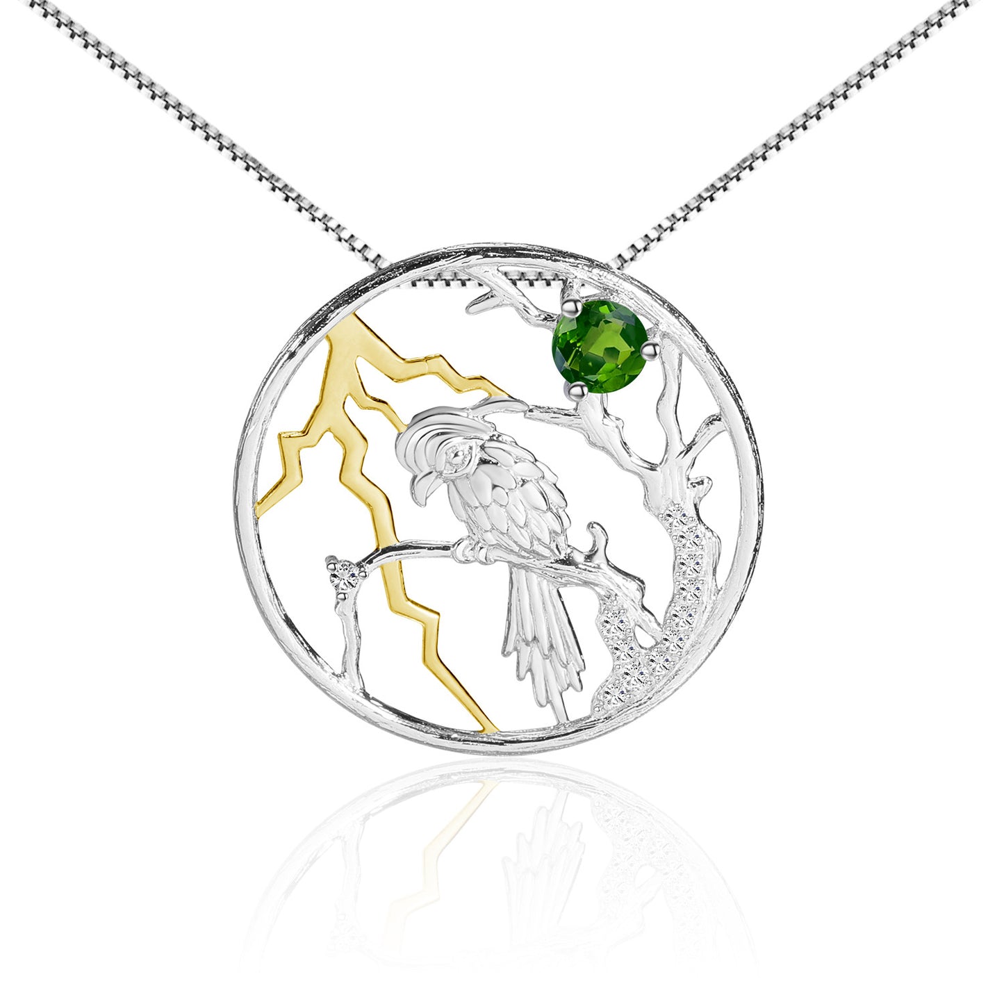 Look stylish and chic with this Designer Premium Natural Bird Pendant Design Natural Topaz Silver Necklace for Women. The circle pendant features an eye-catching parrot design adorned with a colorful gemstone. Enjoy this statement piece and show your unique style with this unique necklace.