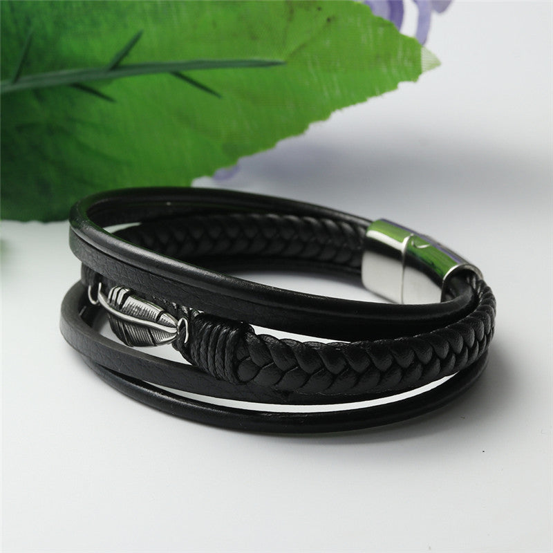 Titanium Steel Woven Feather Leather Bracelet for Men - Personalized Punk Style Accessory