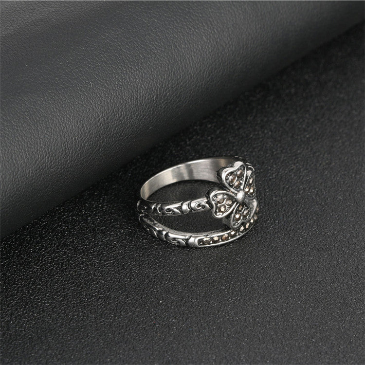 Punk-Inspired Four-Leaf Clover Titanium Steel Ring with Black Zircon Accents for Men and Women