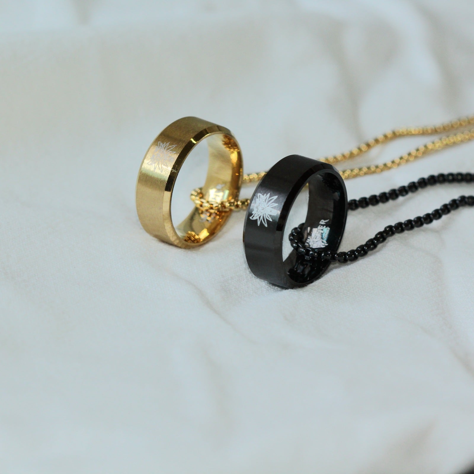 • Complement your outfit with the matching titanium steel ring featuring intricate details