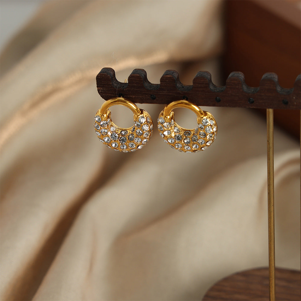 Indulge in the elegance of the European and American new cross-border light luxury design with our exquisite titanium steel plated 18K gold U-shaped geometric zircon earrings for women.