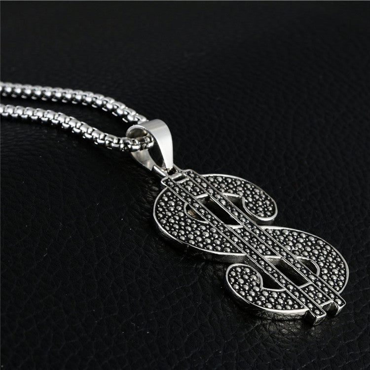 Introducing our trendy European and American spot titanium steel dollar logo pendant necklace, crafted for both men and women who appreciate a touch of retro charm combined with modern flair. This stunning piece seamlessly blends fashion with a statement of wealth and sophistication.