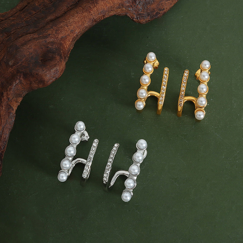 Elegant Dual-Layer Titanium Steel Earrings with Imitation Pearls and Zircon