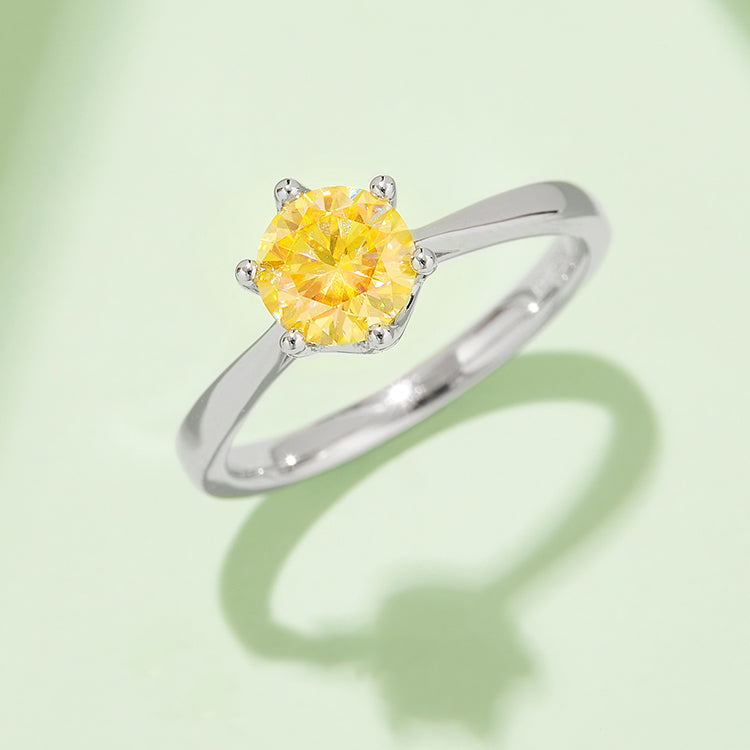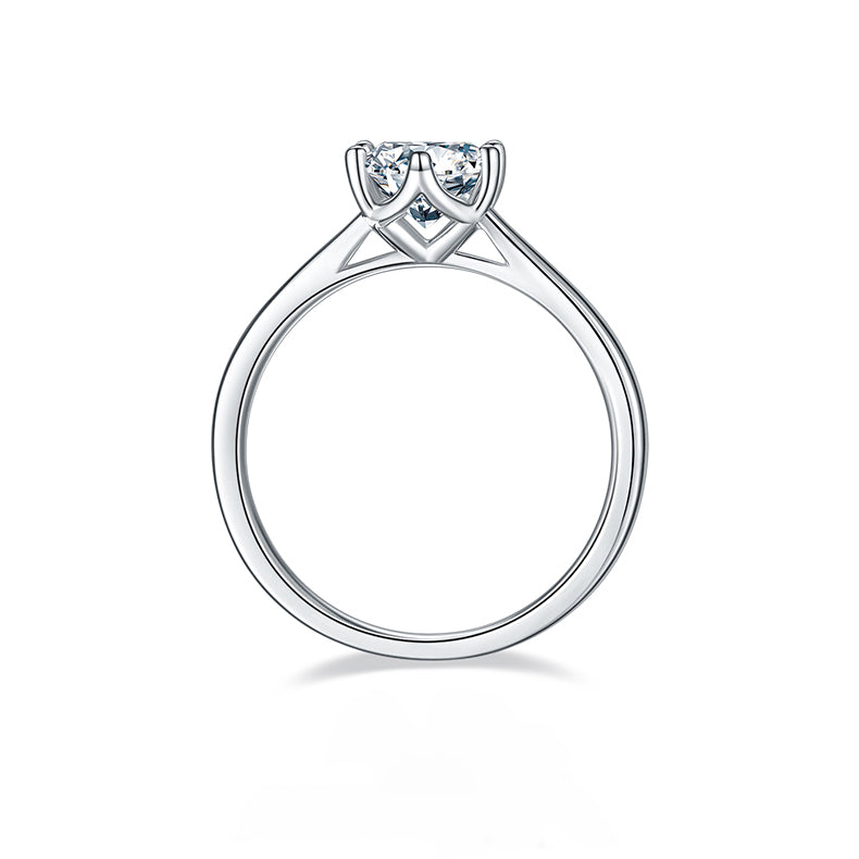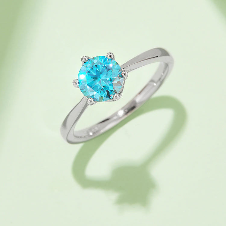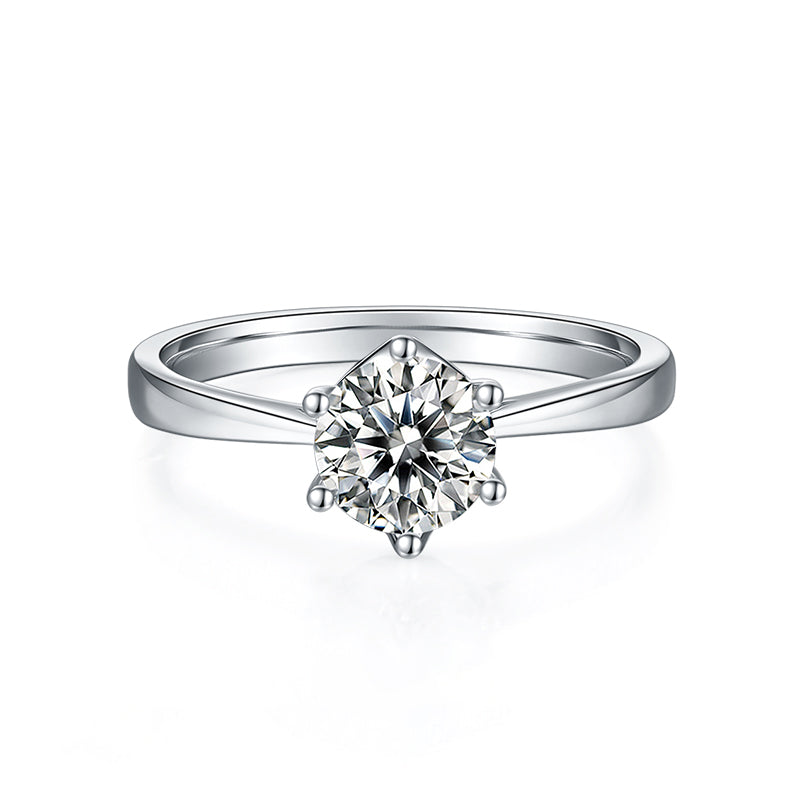 This exquisite ring features a 1.0-carat round cut Moissanite stone. The polished ring band to make the entire ring simple and elegance. In addition, the six-prongs design makes the Moissanite more prominent and sparkly. This ring is very sutible for daily wear and is the preferred gift for birthdays, anniversaries or Valentine’s Day.