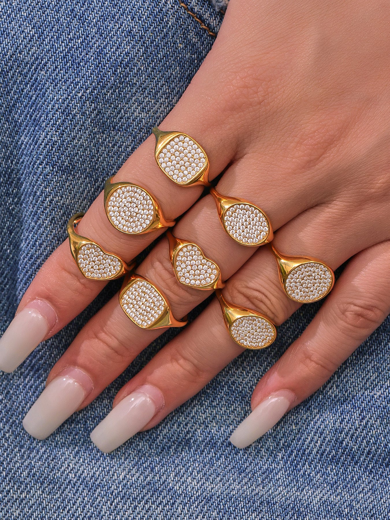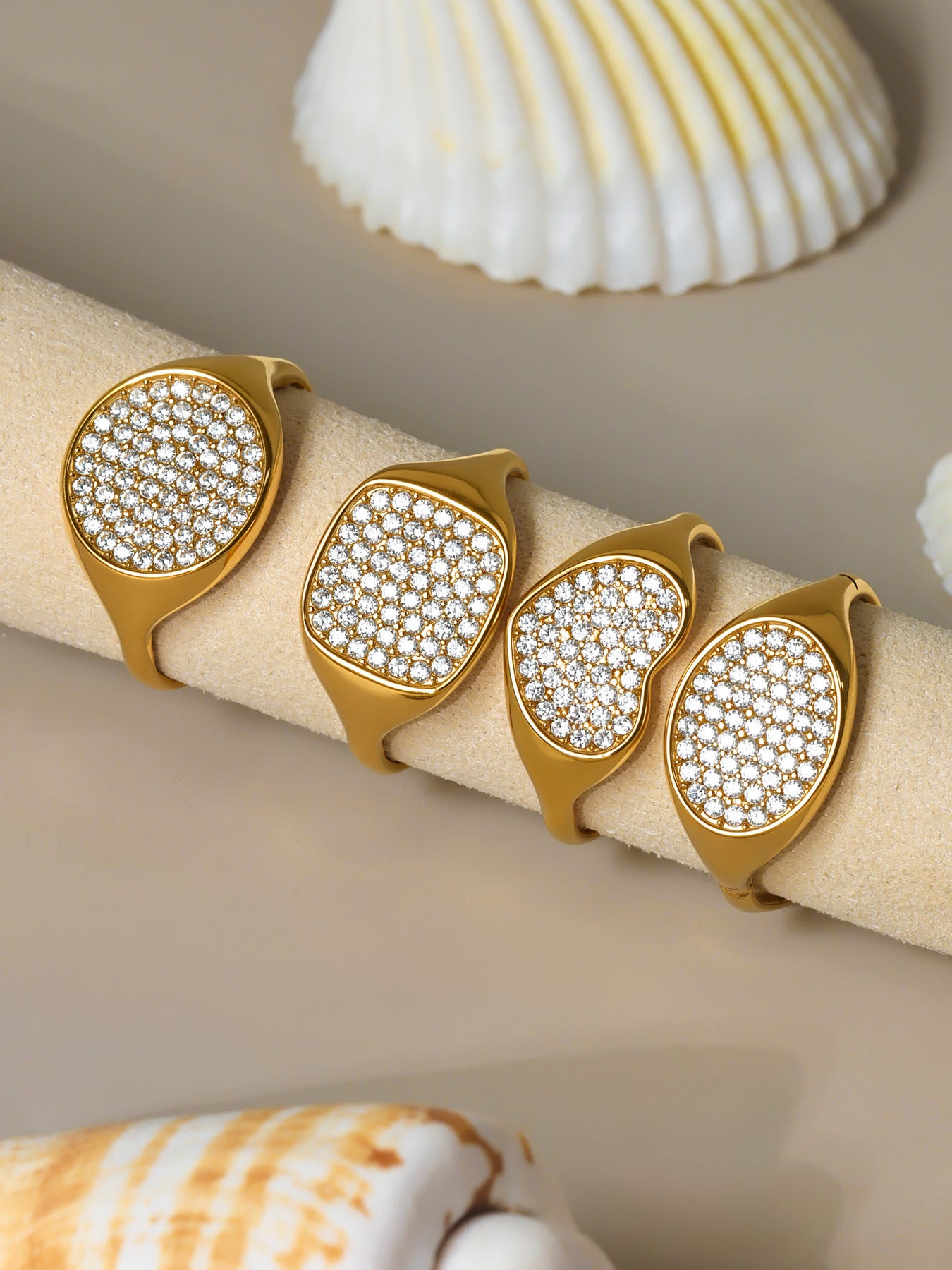 Constructed from sturdy titanium steel with a luminous 18K gold tone, this ring offers durability without compromising on a refined, jewelry-grade appearance. The standout zircon accents deliver brilliant sparkle that catches the light from every angle.