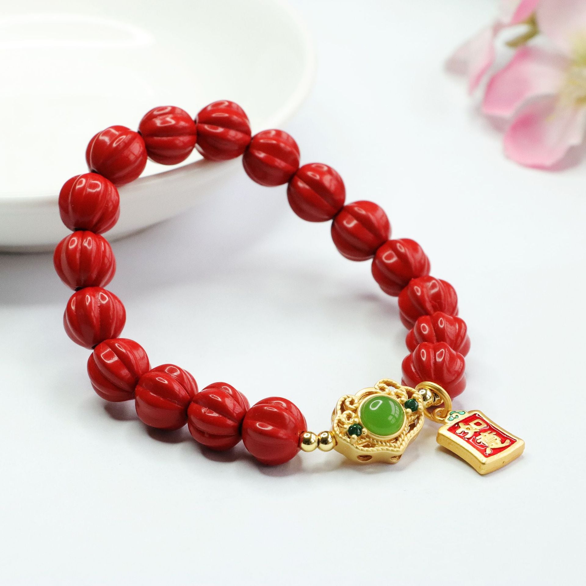 Introducing our Cinnabar Bracelet Red Sand Pumpkin Bead Bracelet from the new Chinese inspired Fortune's Favor Collection by Planderful. Handcrafted with high-quality sterling silver and adorned with stunning cinnabar stone beads, this bracelet is a symbol of prosperity and good fortune.