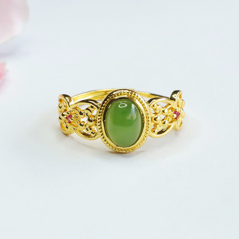 Exquisite Hetian Jade and Jasper Sterling Silver Hollow Ring