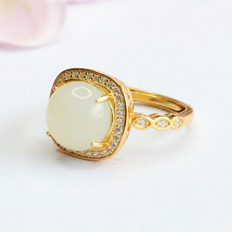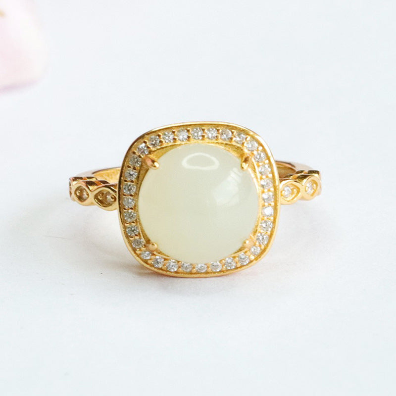 Stunning S925 Silver Hetian Jade Ring with Square Zircon Halo
