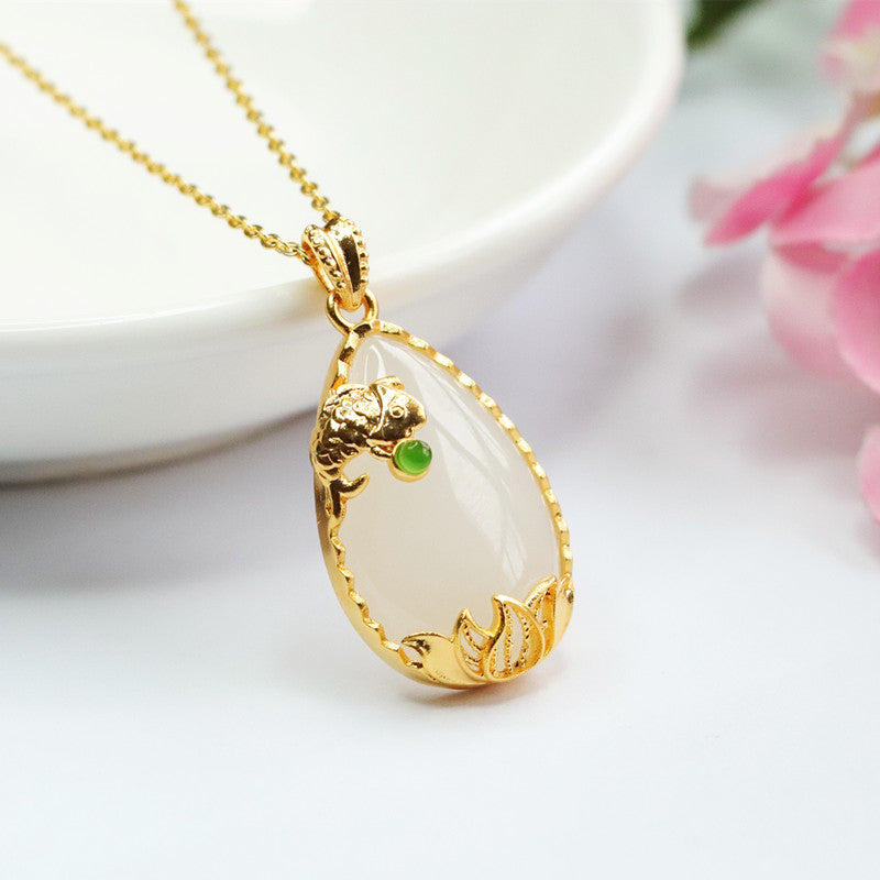 Jade Koi Necklace with Water Drop Hotan Jade Pendant