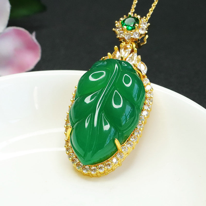 Chalcedony Branch Leaf Pendant Necklace with Zircon Detail