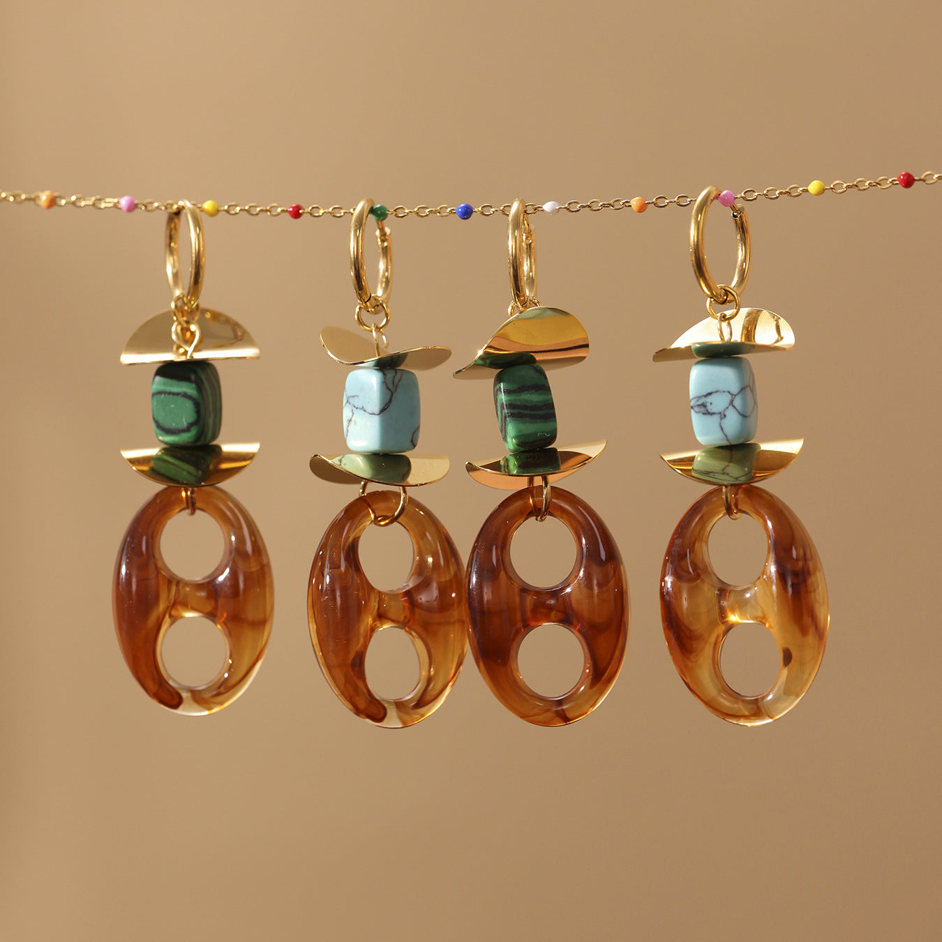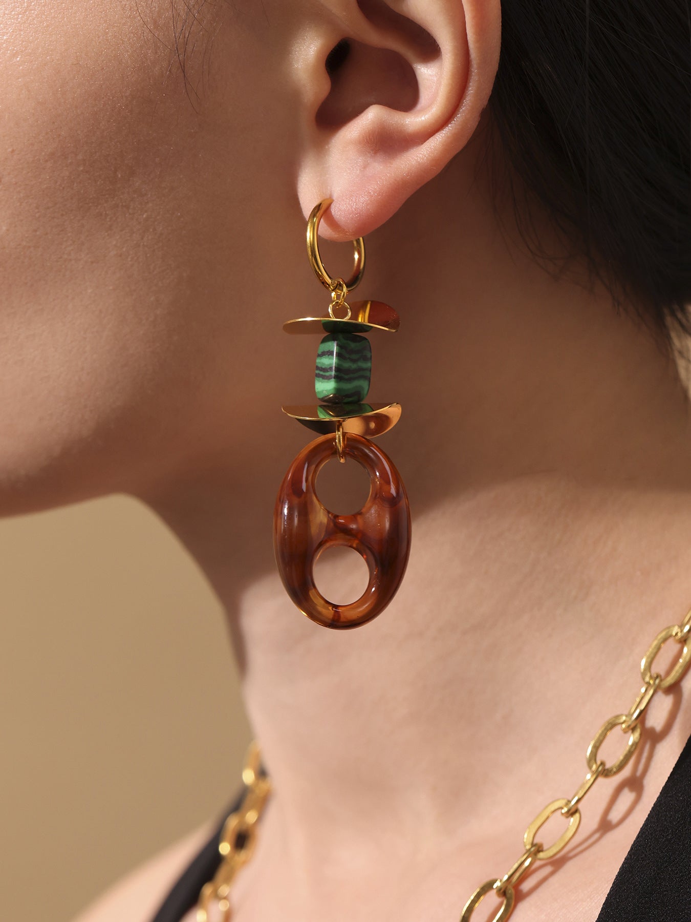 Crafted with metal components and a resin centerpiece, the Merade earrings offer durable construction and an eye-catching centerpiece that stands out in any outfit. The oval resin pig nose motif in warm caramel tones adds warmth and personality to your jewelry collection.