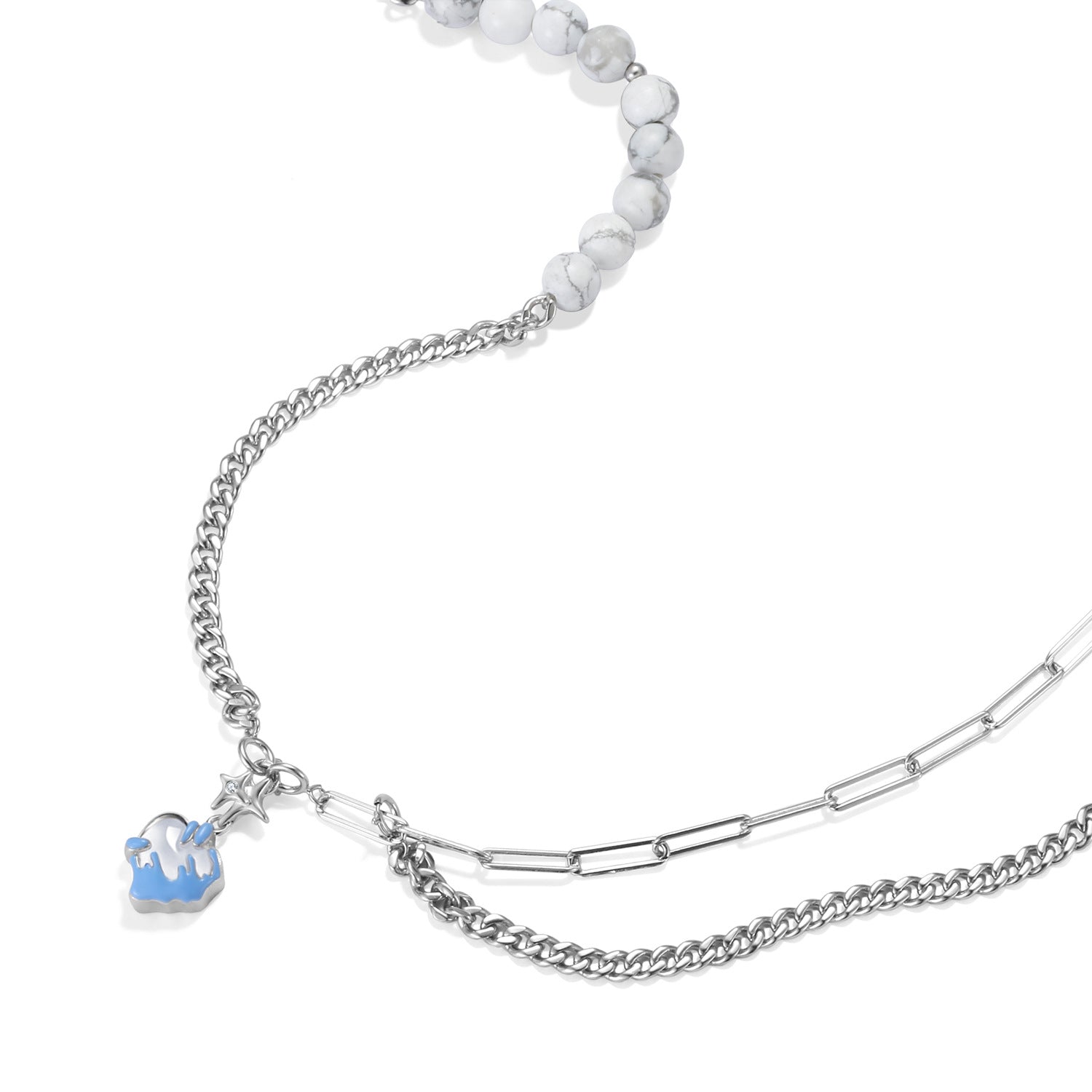 This freely combined Blue Melting Heart Pendant Splice Silver Necklace is perfect for styling a unique look. Each chain and accessory is equipped with a spring buckle, allowing you to make your necklace to your desired style. The Blue Melting Heart Pendant adds a trendy and eye-catching element. Create a one-of-a-kind look with this DIY necklace.