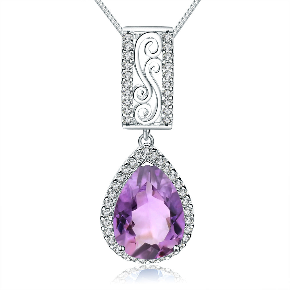 European Style Inlaid Natural Amethyst Soleste Halo Pear Drop Pendant Silver Necklace for Women