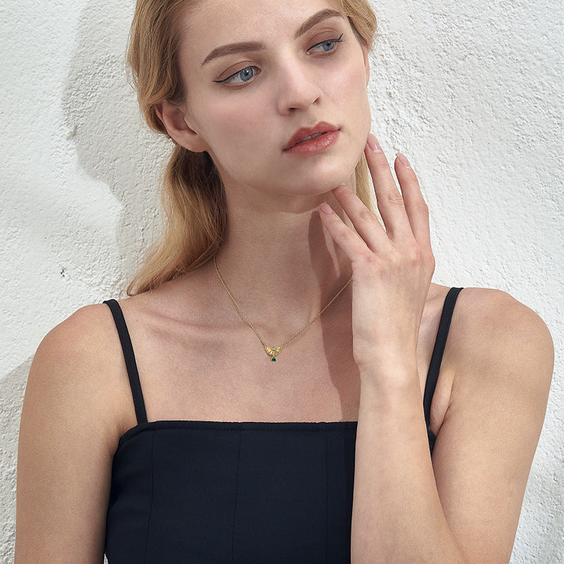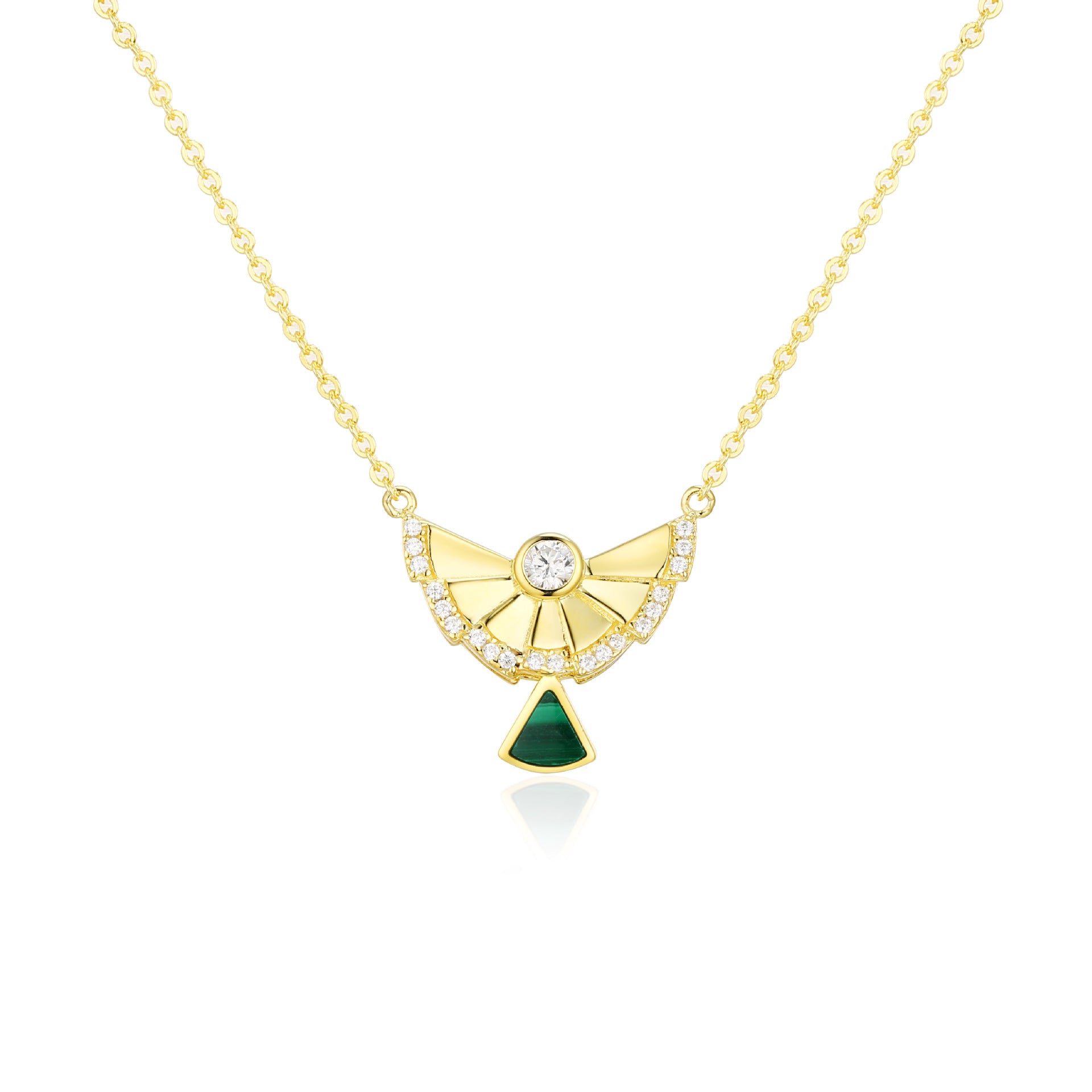 This unique fan pendant sterling silver necklace for women hang with a triangle natural malachite, enhancing its exquisite beauty. The malachite is a semi-precious stone with an iconic green color that symbolizes power and influence. This necklace offers an elegant look for any outfit.