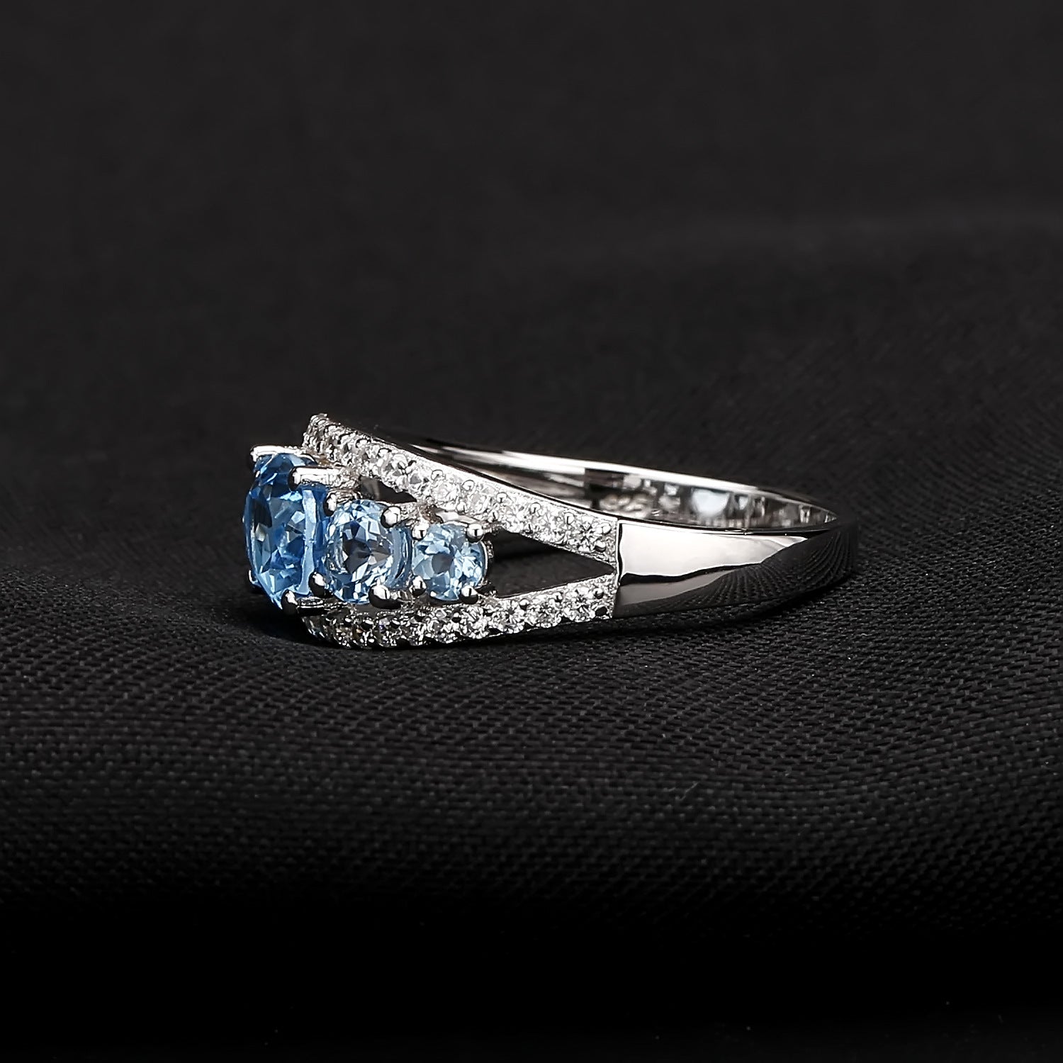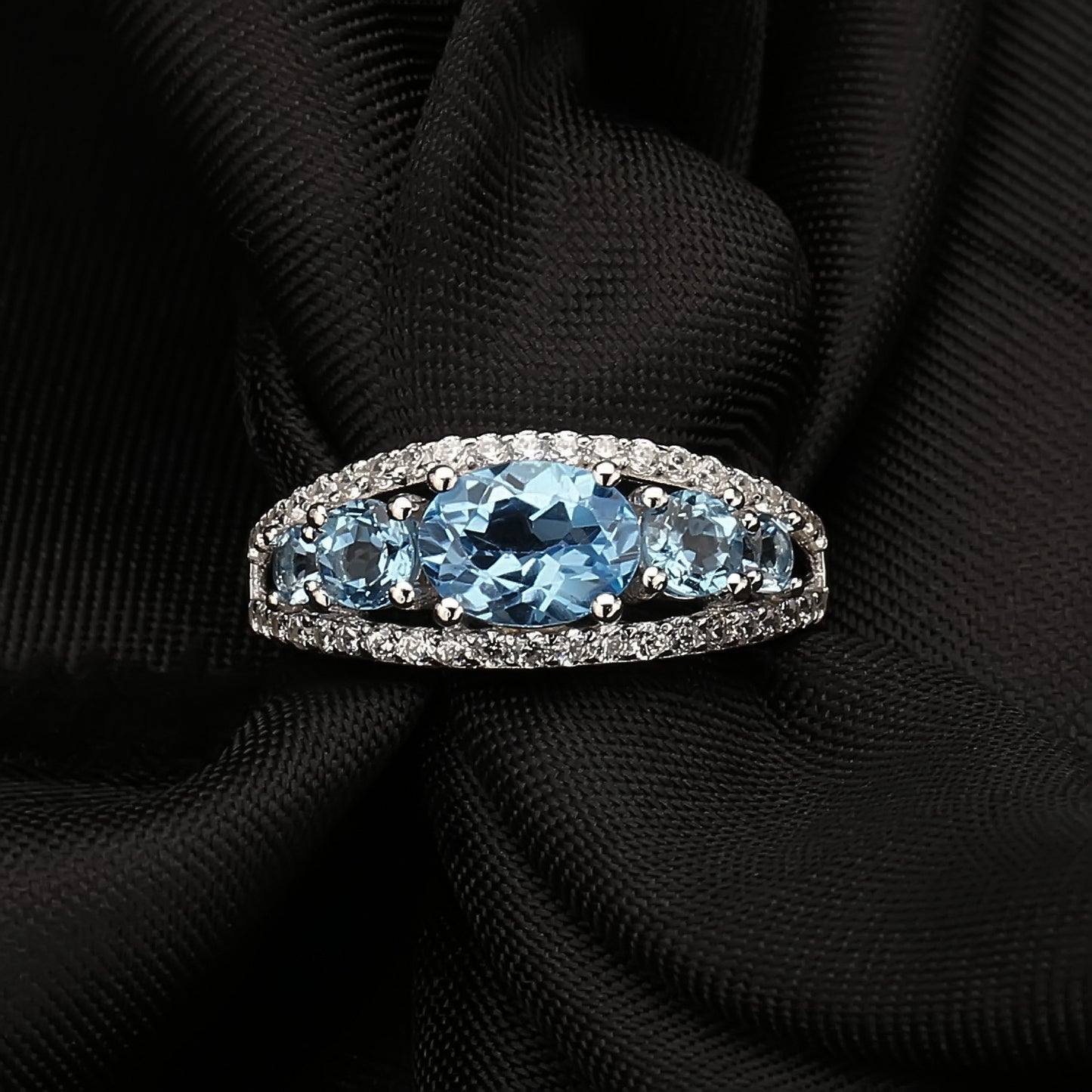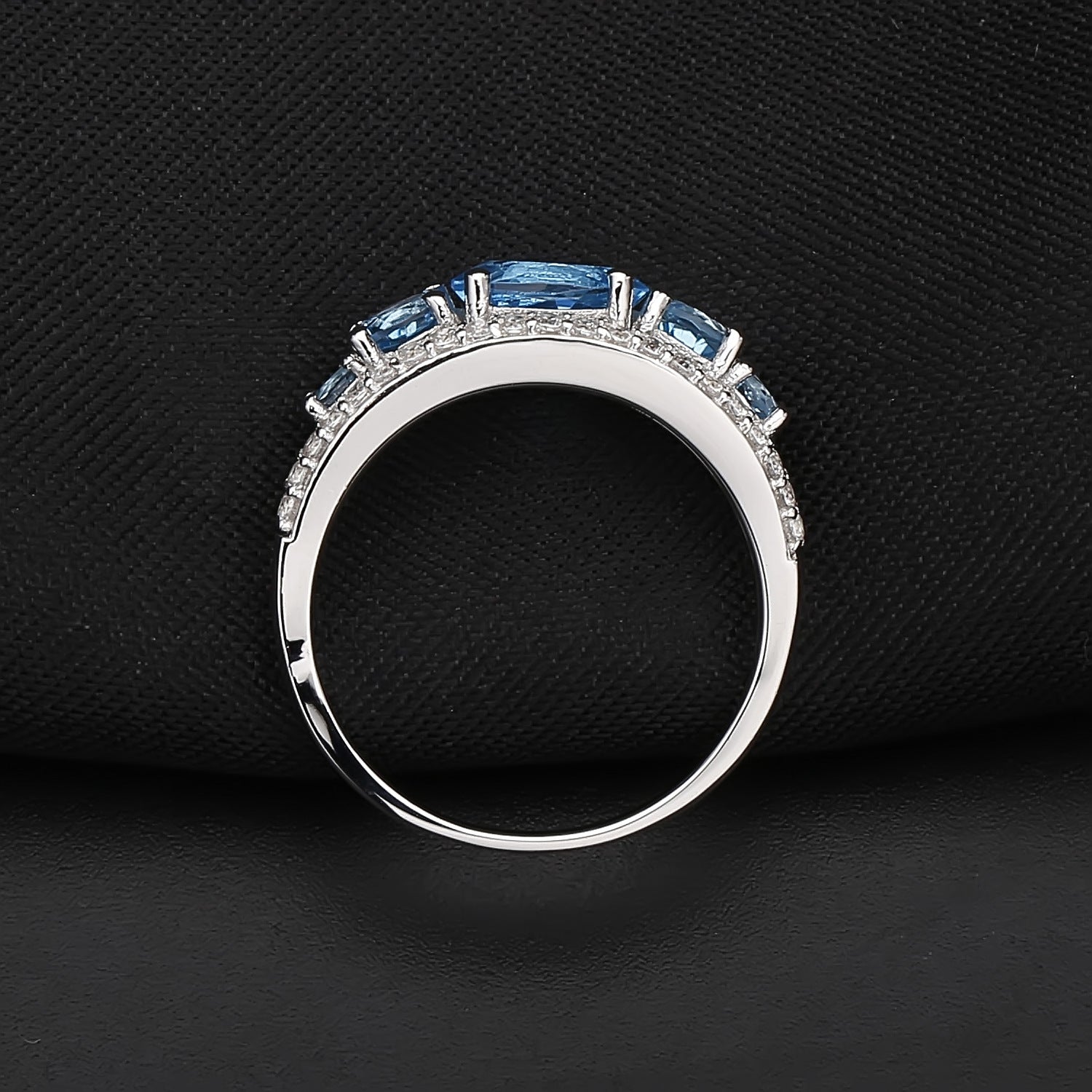This luxurious ring is perfect for a modern woman. Crafted with sterling silver and inlaid with five natural blue topaz, it adds a timeless touch to any outfit. The double layer hollow ring arms are intricately decorated with zircons, creating a stunning effect. Show off your sense of style with this beautiful ring.