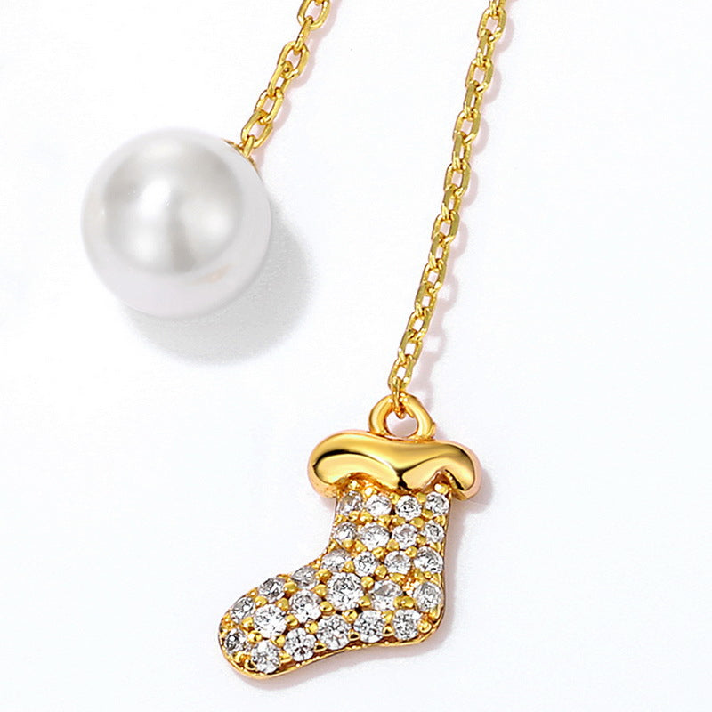 Zircon Christmas Sock and Tree Long Tassel Round Pearl Asymmetric Sterling Silver Earrings