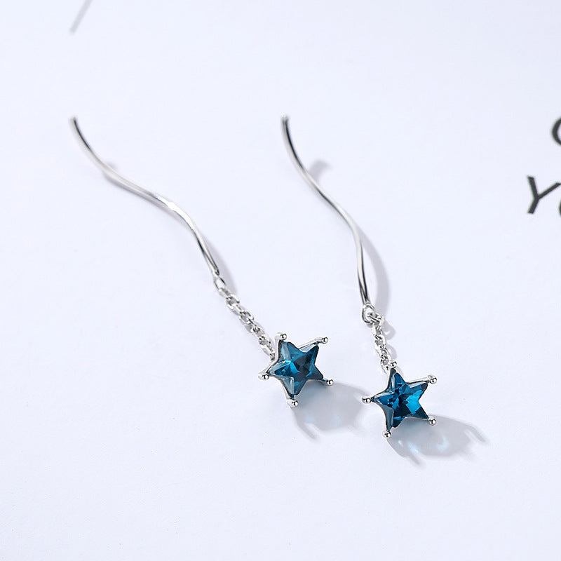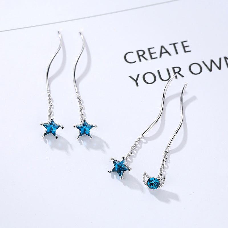 Blue Zircon Star Moon Asymmetric Ear Line Silver Drop Earrings for Women