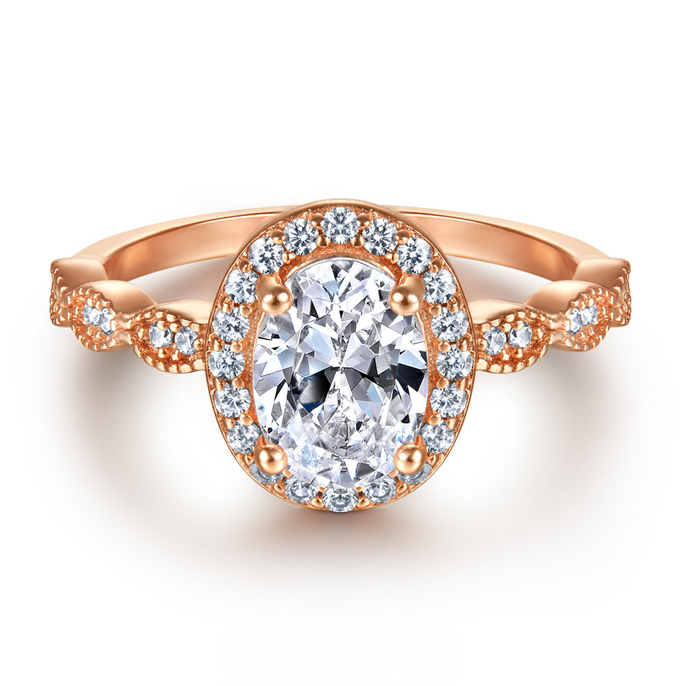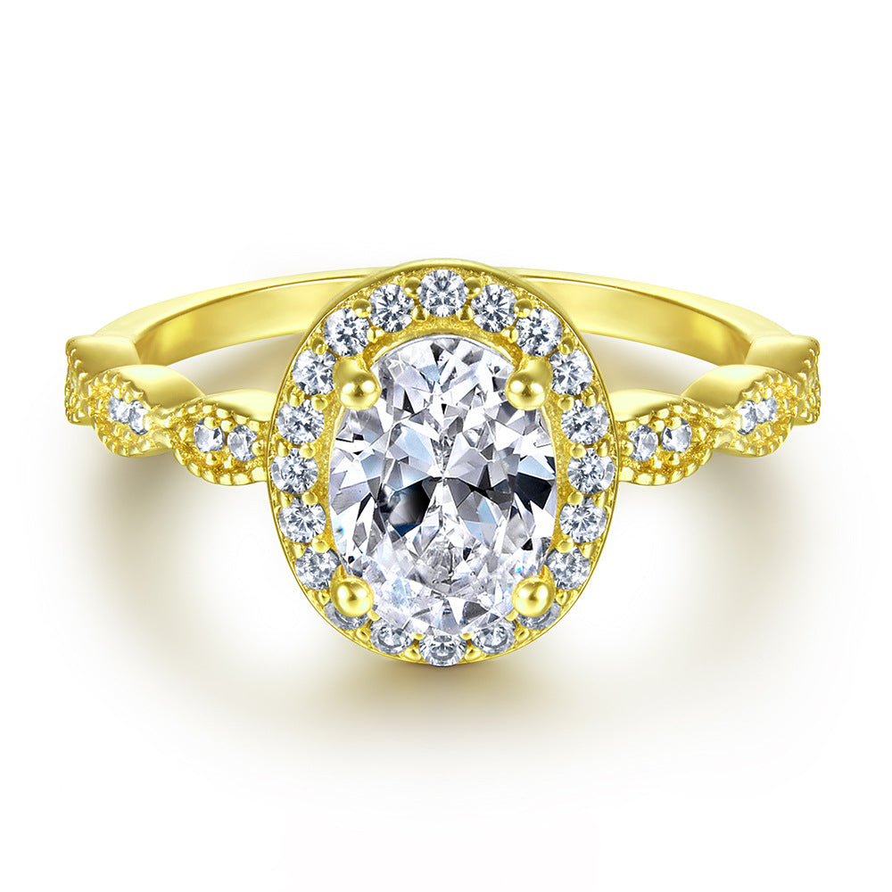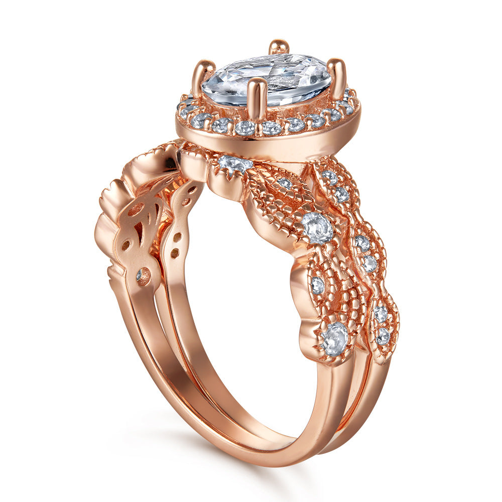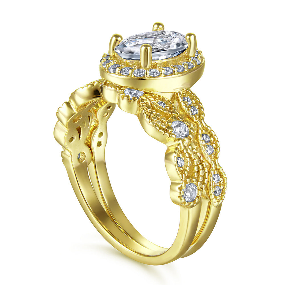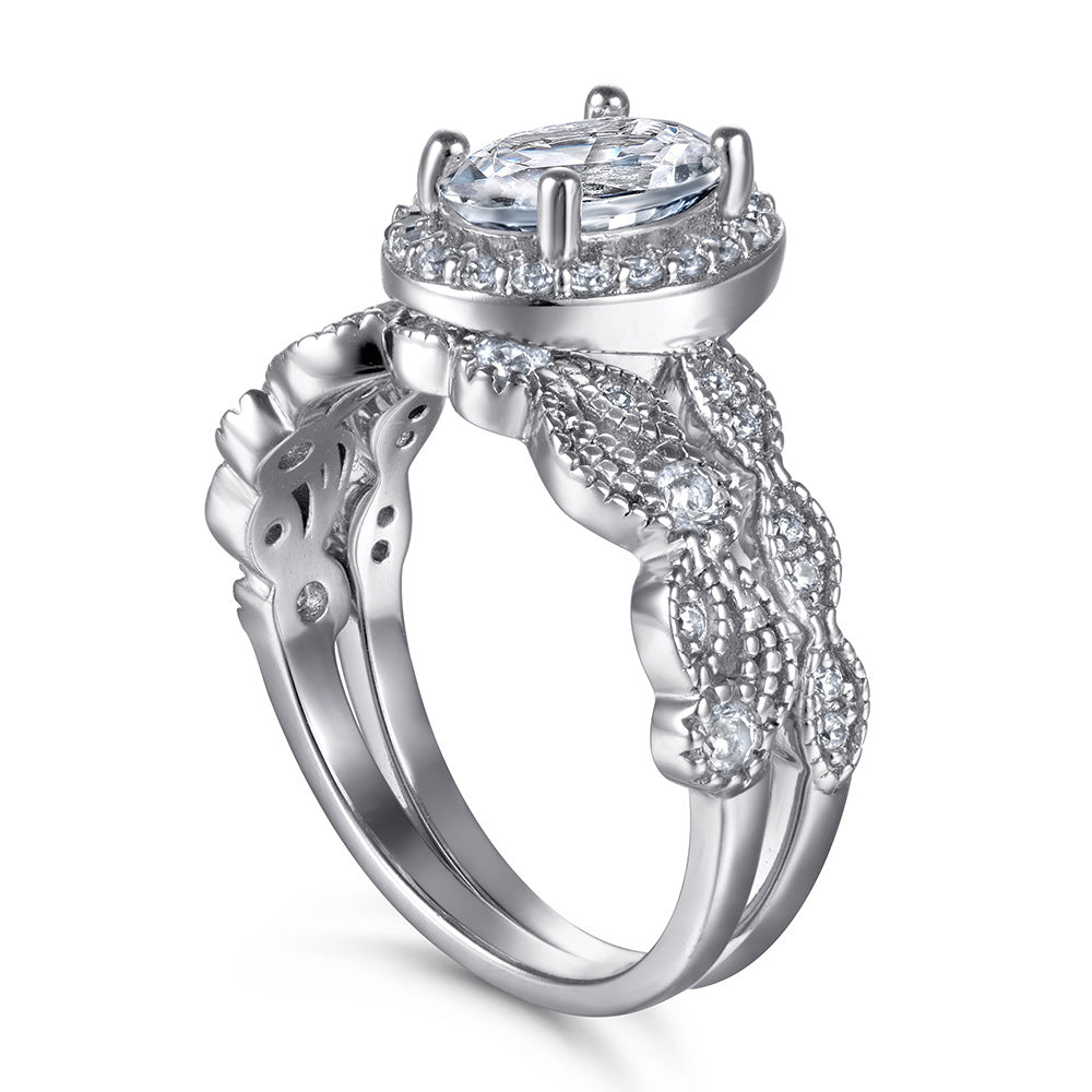Oval Zircon Soleste Halo Retro Pattern Silver Ring Set for Women