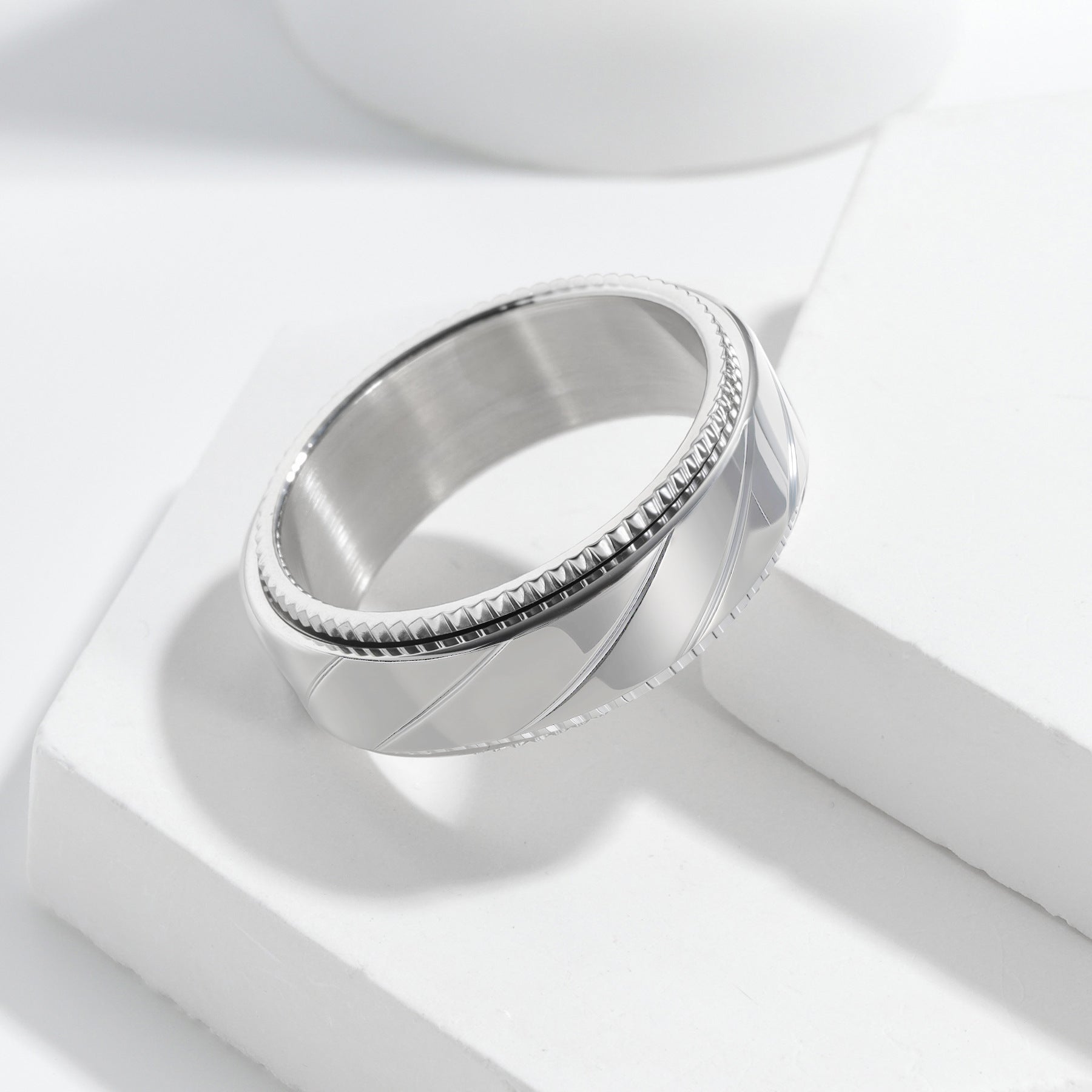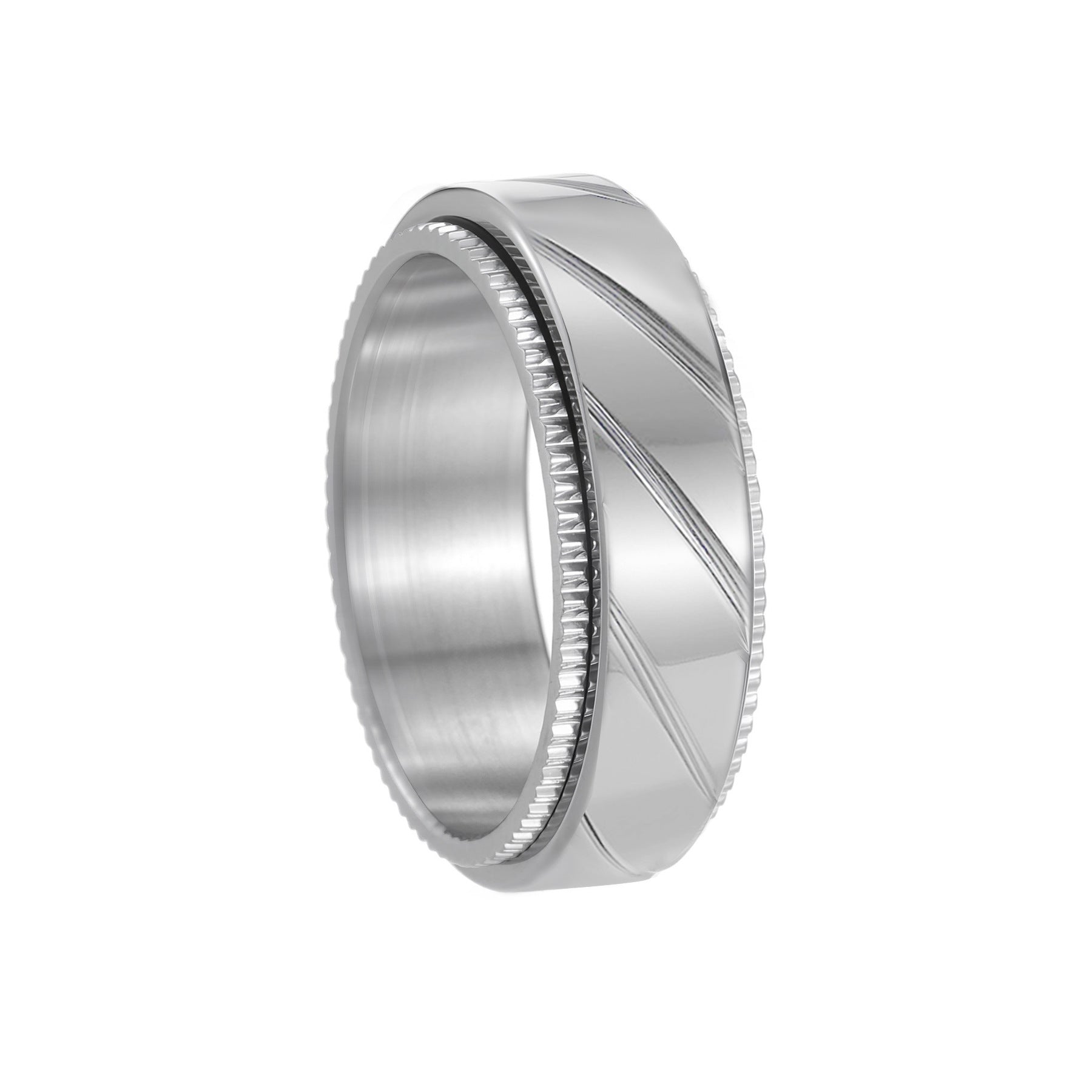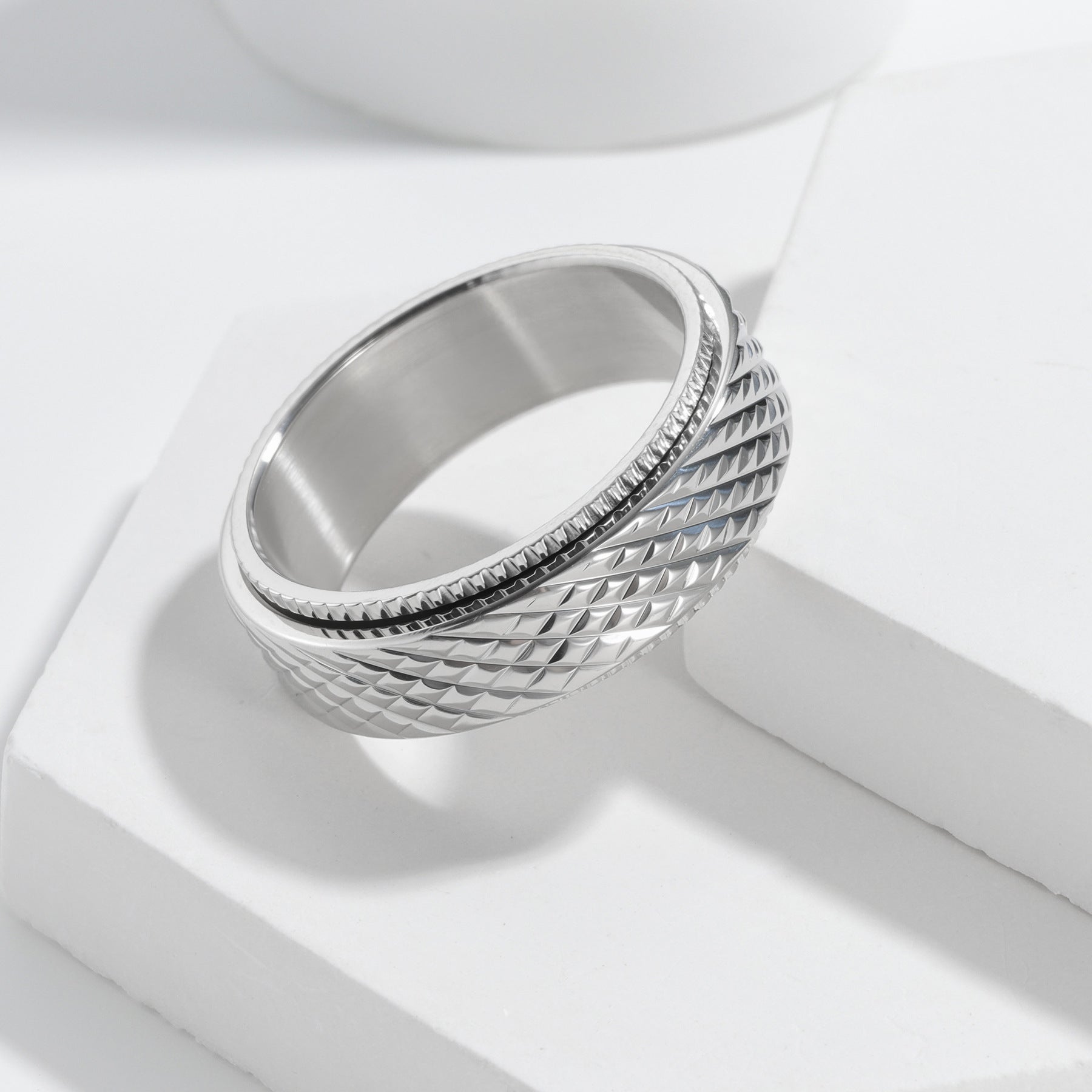 The ring uses vacuum-plated titanium steel for a high-gloss finish that resists scratches and tarnish. The reticulated pattern adds texture and edge, while the rotatable feature gives you subtle versatility with every movement.