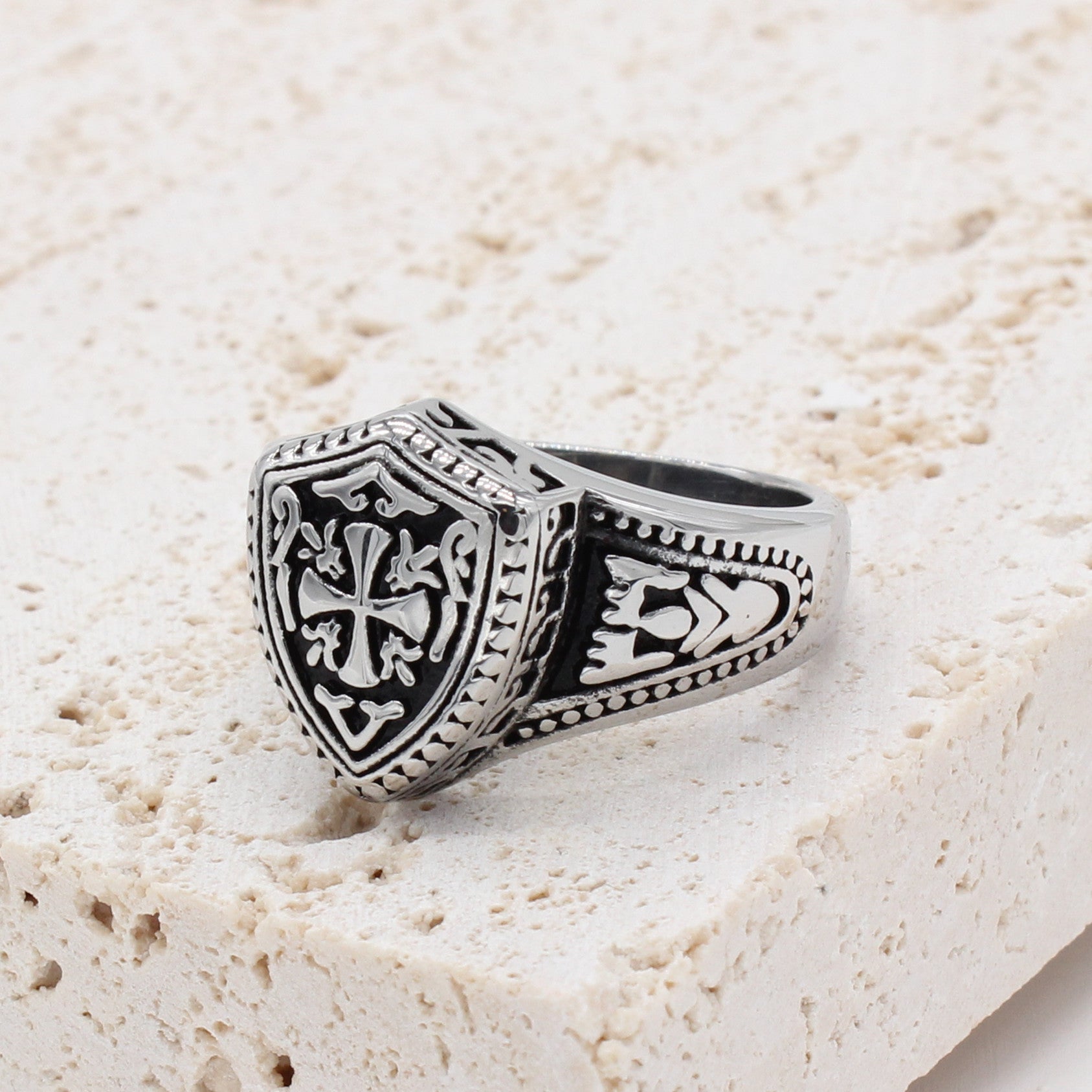 Embrace the durability and sophistication of titanium steel, making this ring a lasting addition to your collection. The striking vintage cross knight shield design adds a bold and distinctive touch, making it a standout accessory for any modern-day knight.