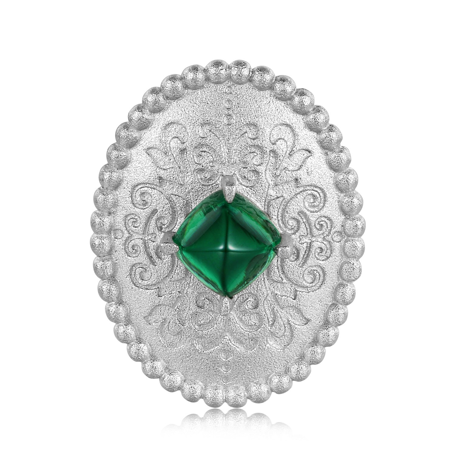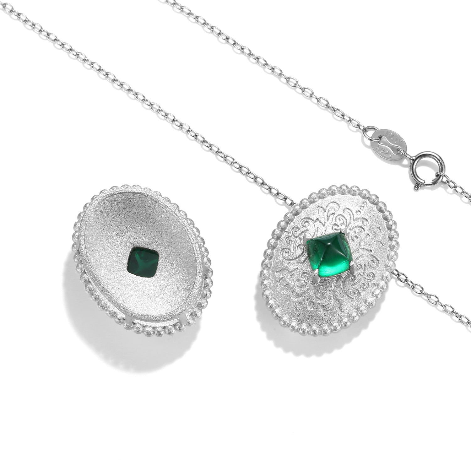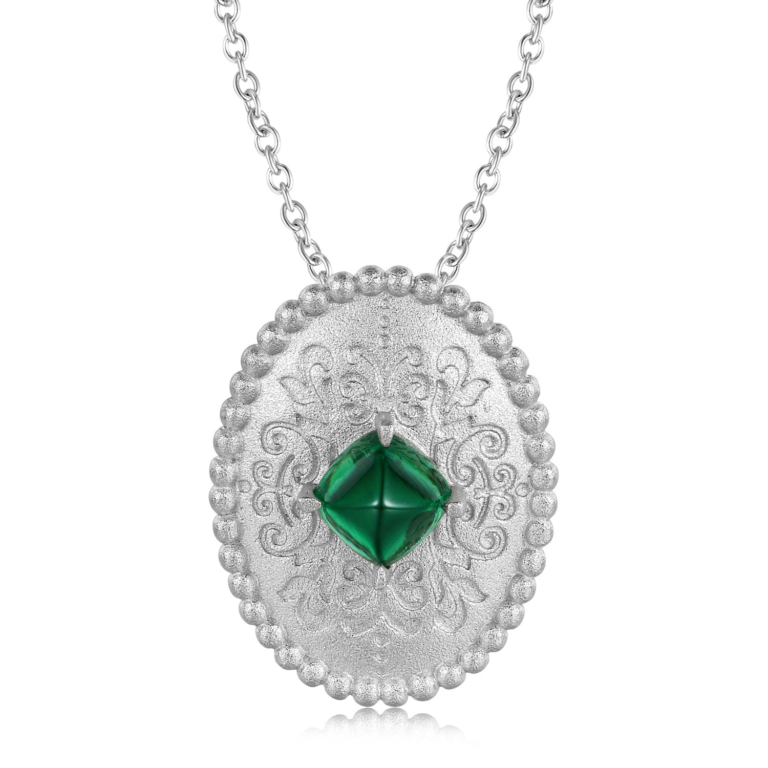 Make a statement with this Sandblasting Retro Pattern Oval Pendant Silver Necklace. The pendant features a square green Zircon in the center for extra sparkle. Crafted out of sterling silver, this necklace is sure to add a sophisticated touch to any ensemble.