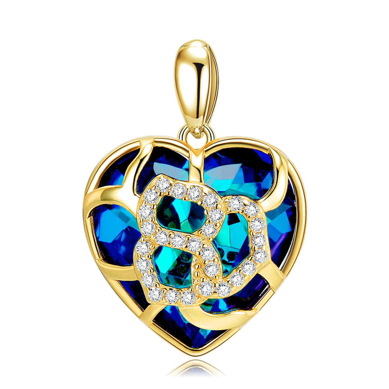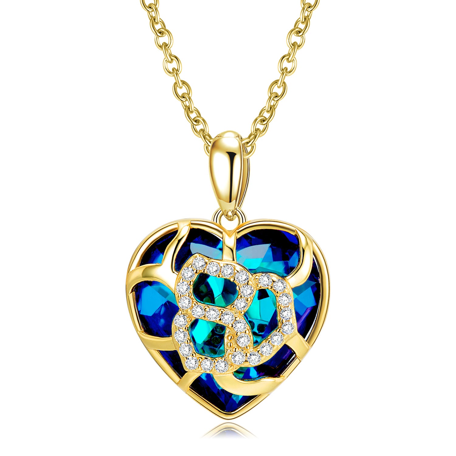 Make a bold statement with this Hollow Pattern Heart Shape Pendant Blue Zircon Silver Necklace. Crafted with a heart-shaped Blue Zircon inlaid in a Hollow Pattern Heart Shape Pendant, made of sterling silver plated in gold, this necklace is sure to bring out the best in any ensemble.