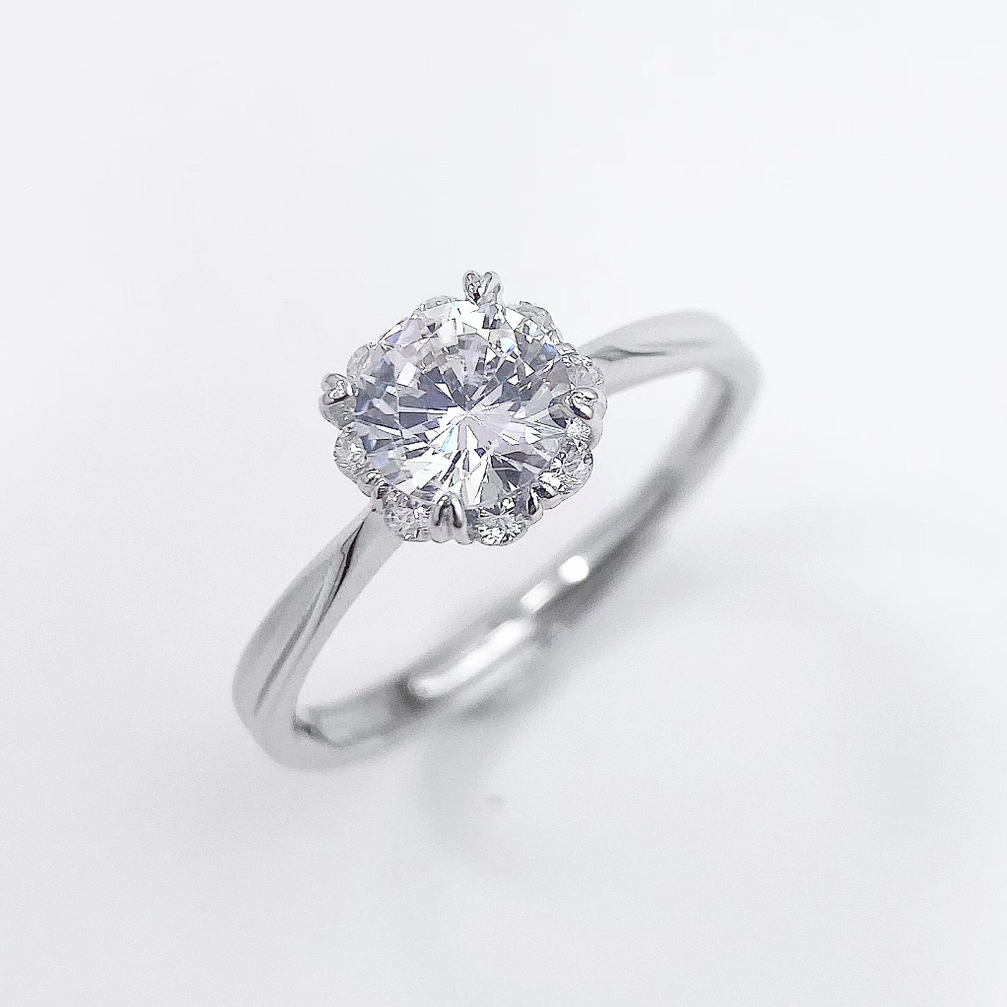 Four Heart-shape Prongs Round Zircon Flower Solitaire Silver Ring for Women