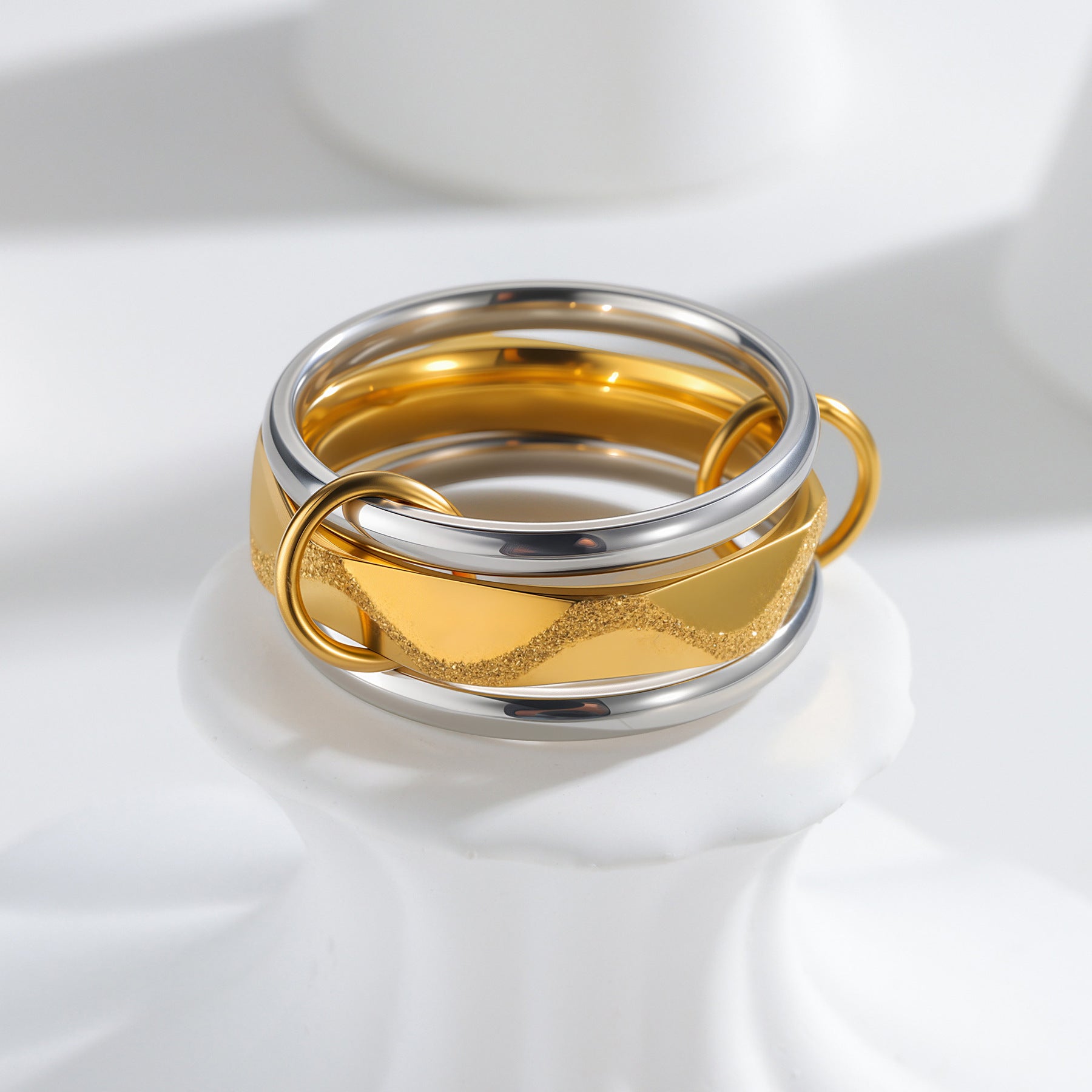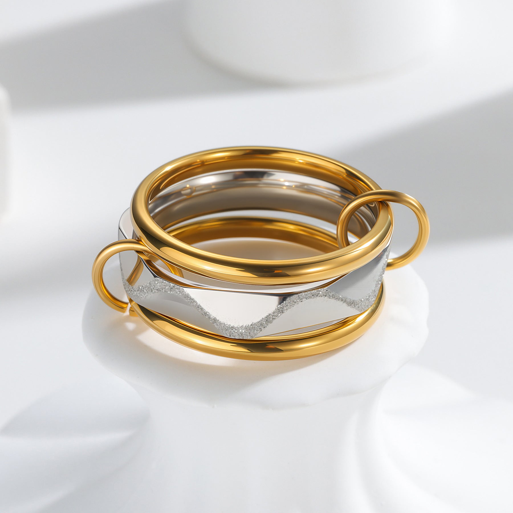 • Style: Three-layer stacked ring; wear as a single statement piece or as separate rings