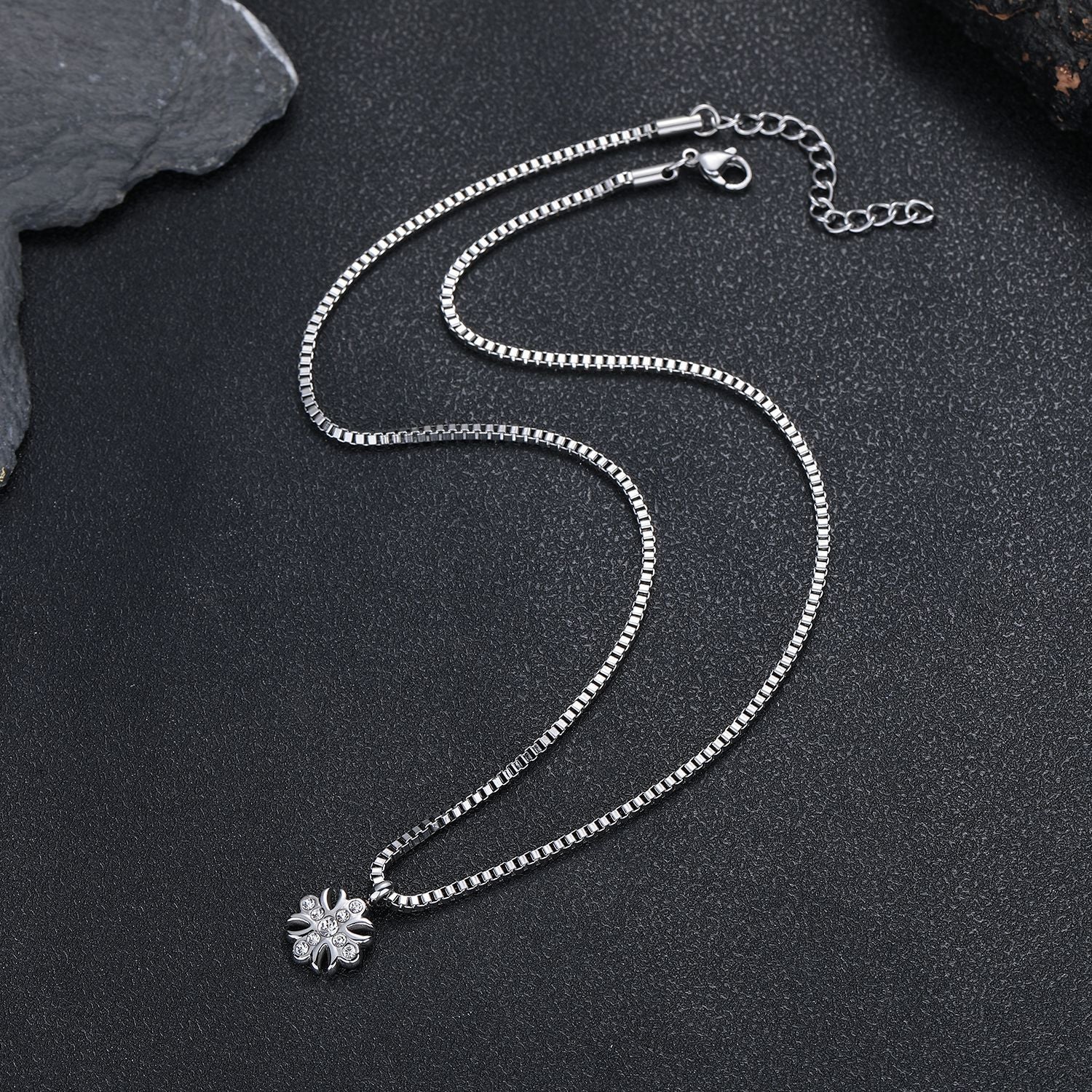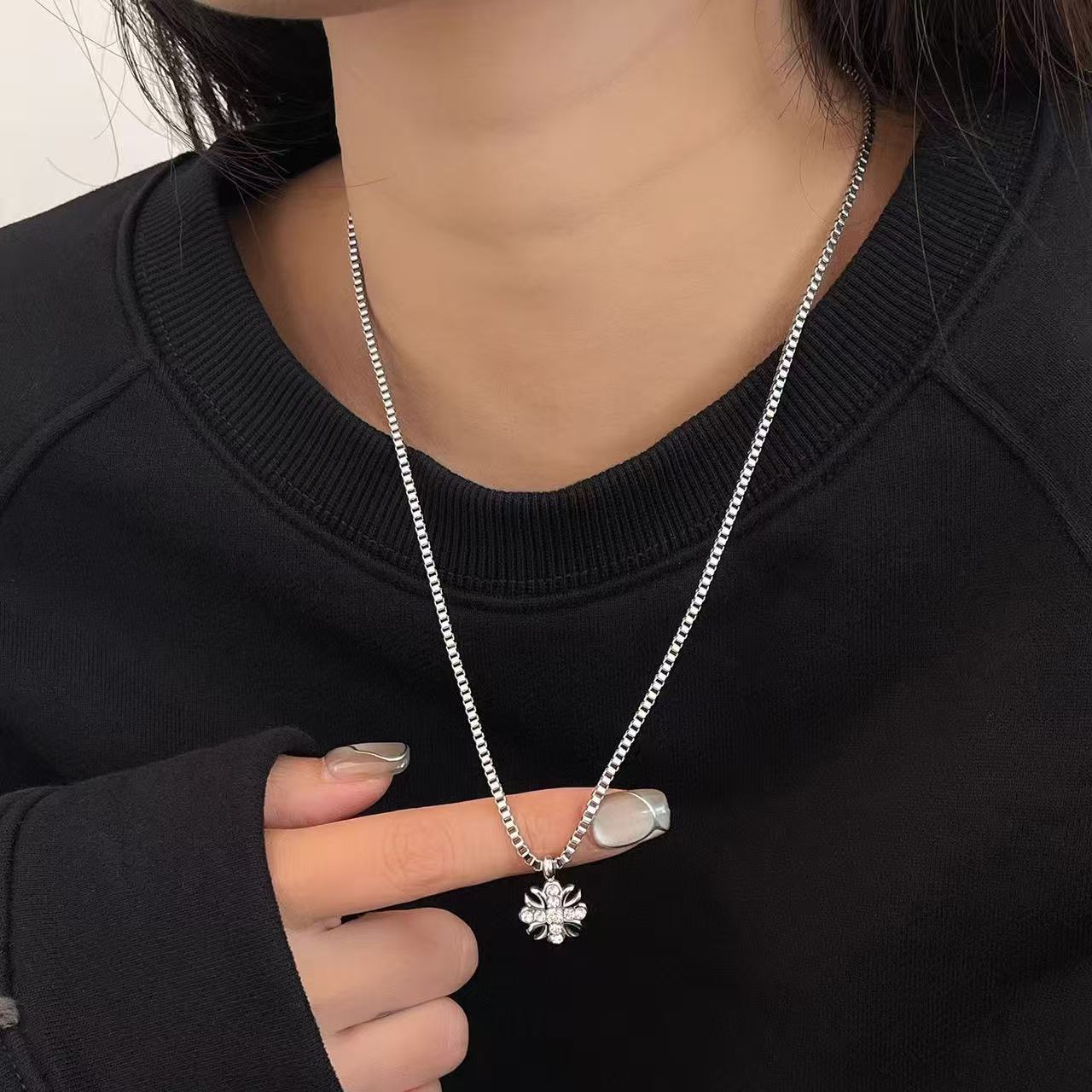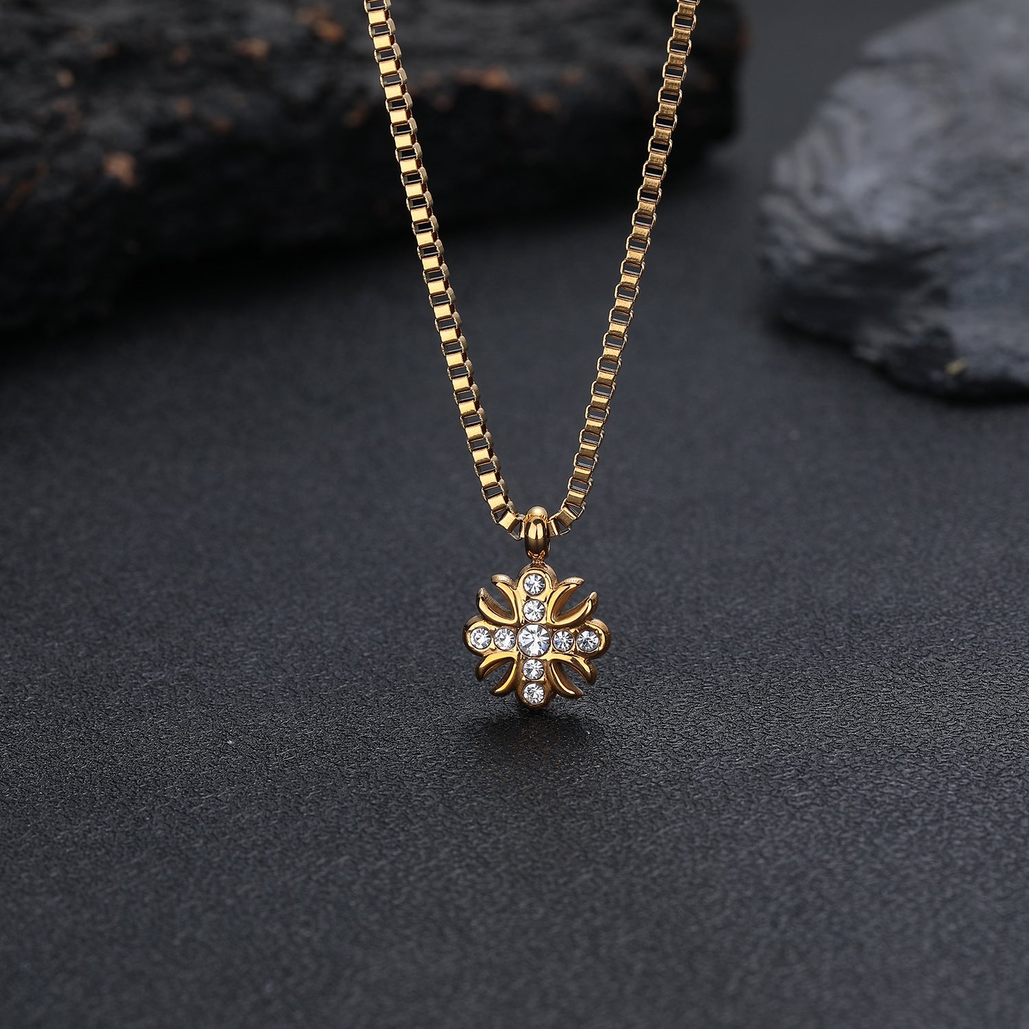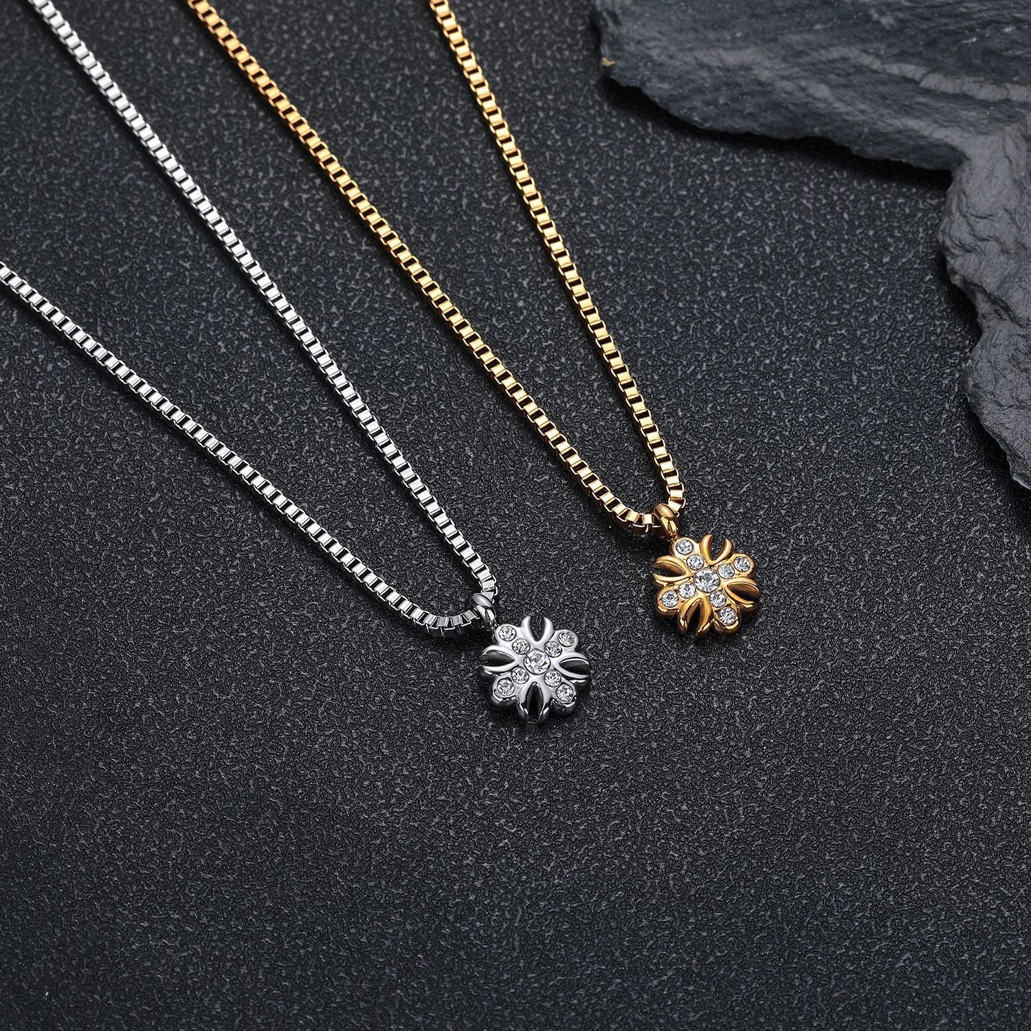 This pendant necklace brings a distinctive, two-tone presence to any outfit. The cross-flower silhouette is both symbolic and contemporary, while the zircon crystals catch light with every movement—adding subtle luxury without shouting. Crafted in durable titanium steel, it stands up to daily wear and pairs beautifully with both a simple tee and a tailored jacket. Whether you’re treating yourself or gifting it, this piece elevates mood and style, making ordinary moments feel a little more special.