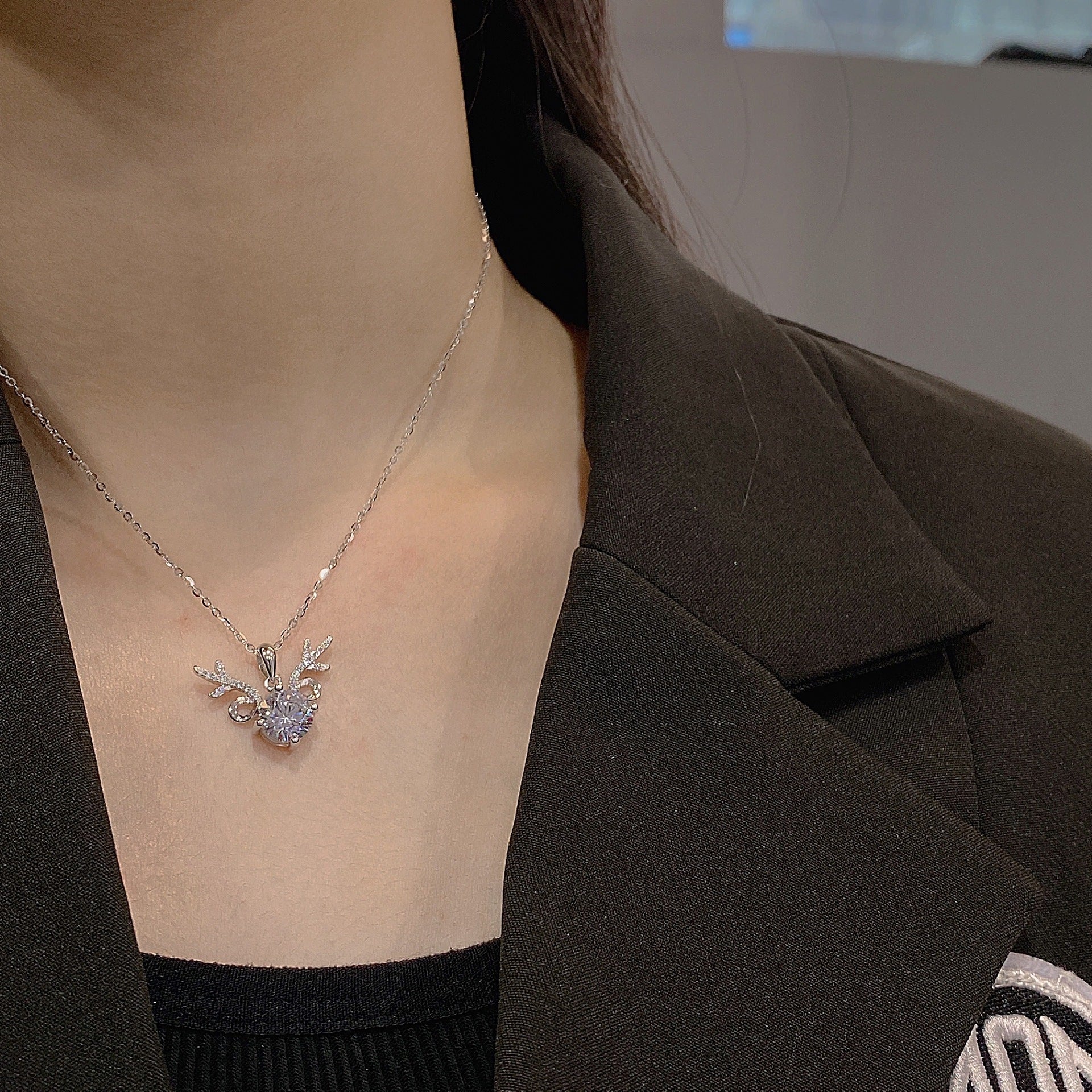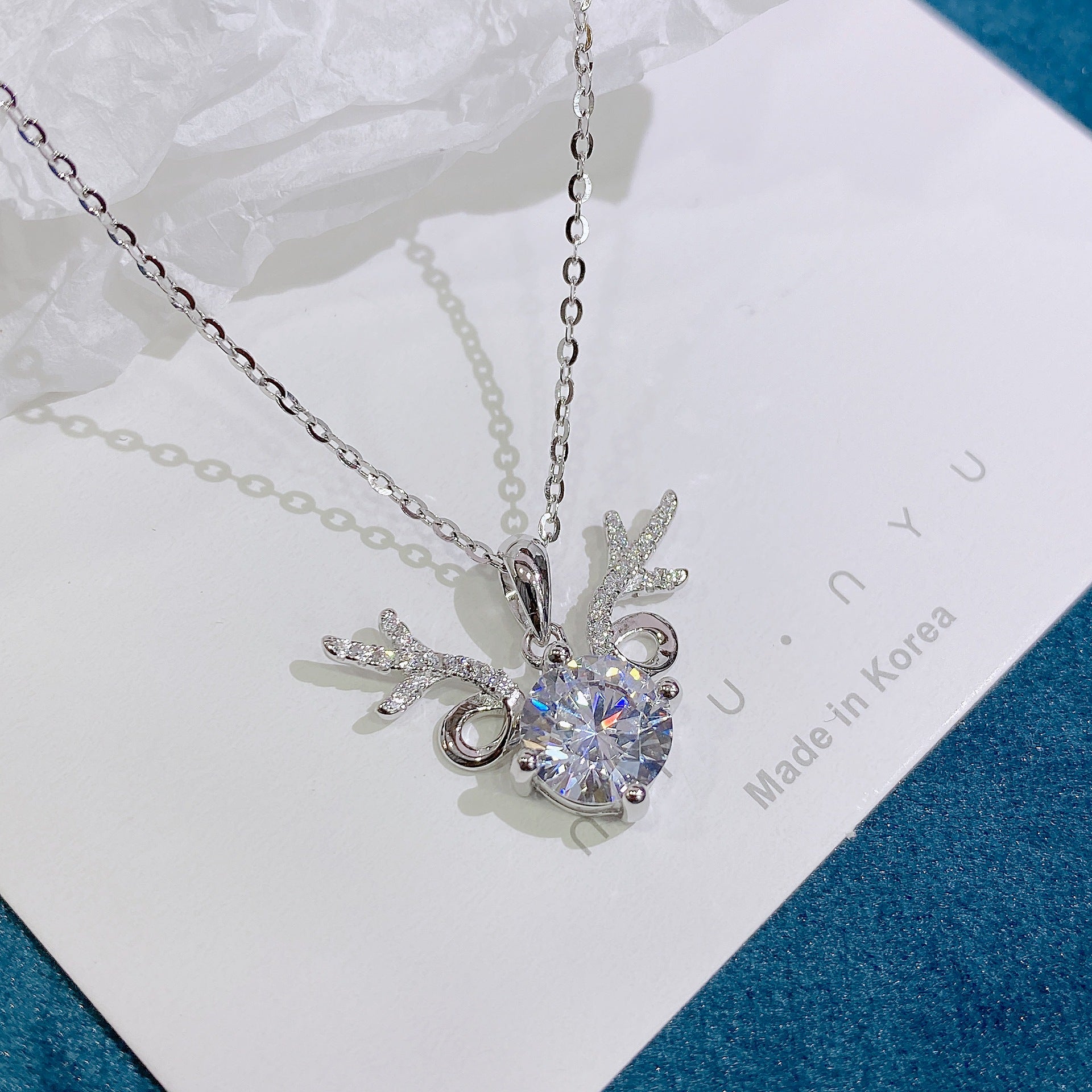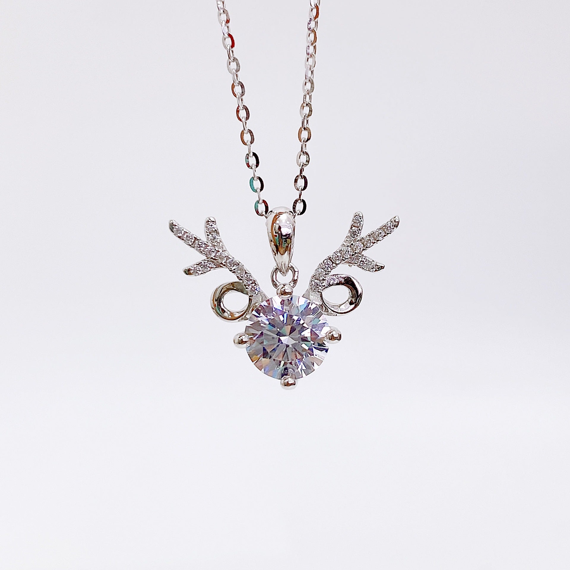 Round Zircon Antler Pendant Silver Necklace for Women
