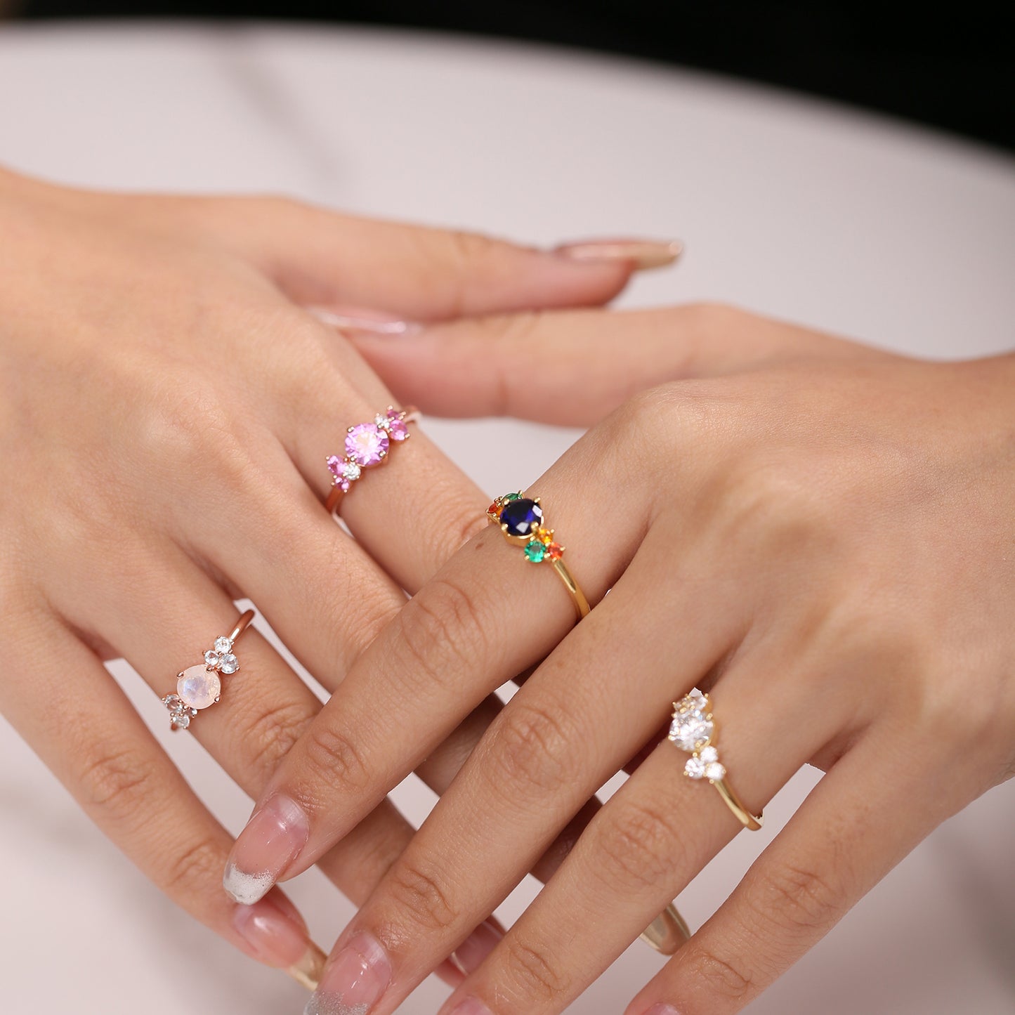 This elegant Round Cut Natural Moonstone Silver Ring features a dazzling round shape Moonstone in center, meticulously framed by six small round blue zircon on the ring arm. Crafted from sterling silver plated in rose gold, this timeless and beautiful ring is sure to make a statement.