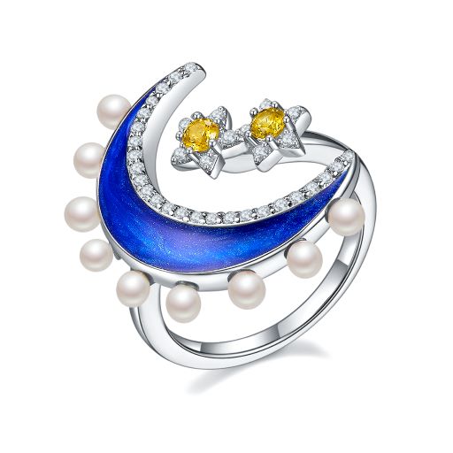 Moon Star with Pearl Blue Enamel Sliver Ring